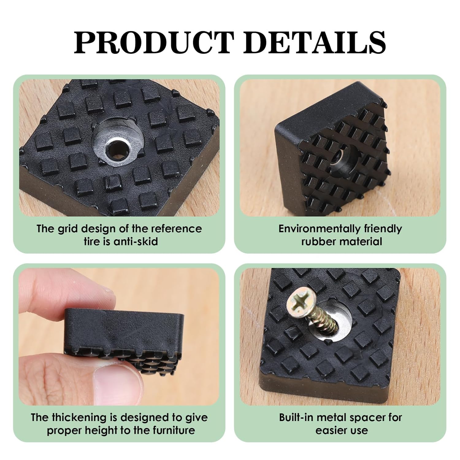- DURABLE AND LONG-LASTING: Theseblack square rubber furniture pads are designed to be resilient and long-lasting, providing reliable protection for your floors and furniture. Their moisture resistance makes them suitable for different environments, including outdoor settings like gardens.