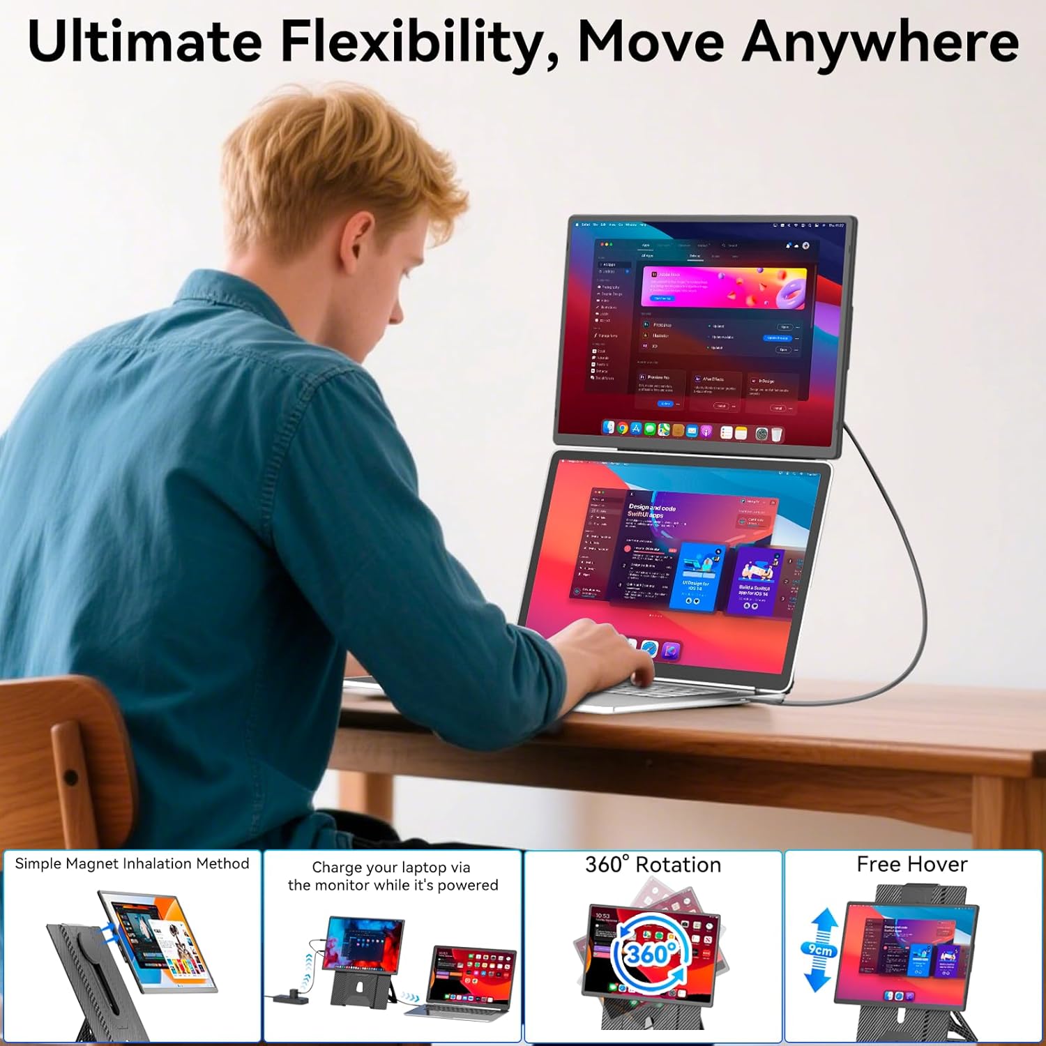 - 【Magnetic Suction Loading & Reverse Charging】The laptop extender screen can be installed magnetically, adjust the height freely, hover freely, and supports 360° rotation display to meet the needs of multi-angle display. When the laptop screen extender monitor’s TPYE-C interface is connected to an external PD power supply, it can quickly charge the computer device with reverse PD100W.