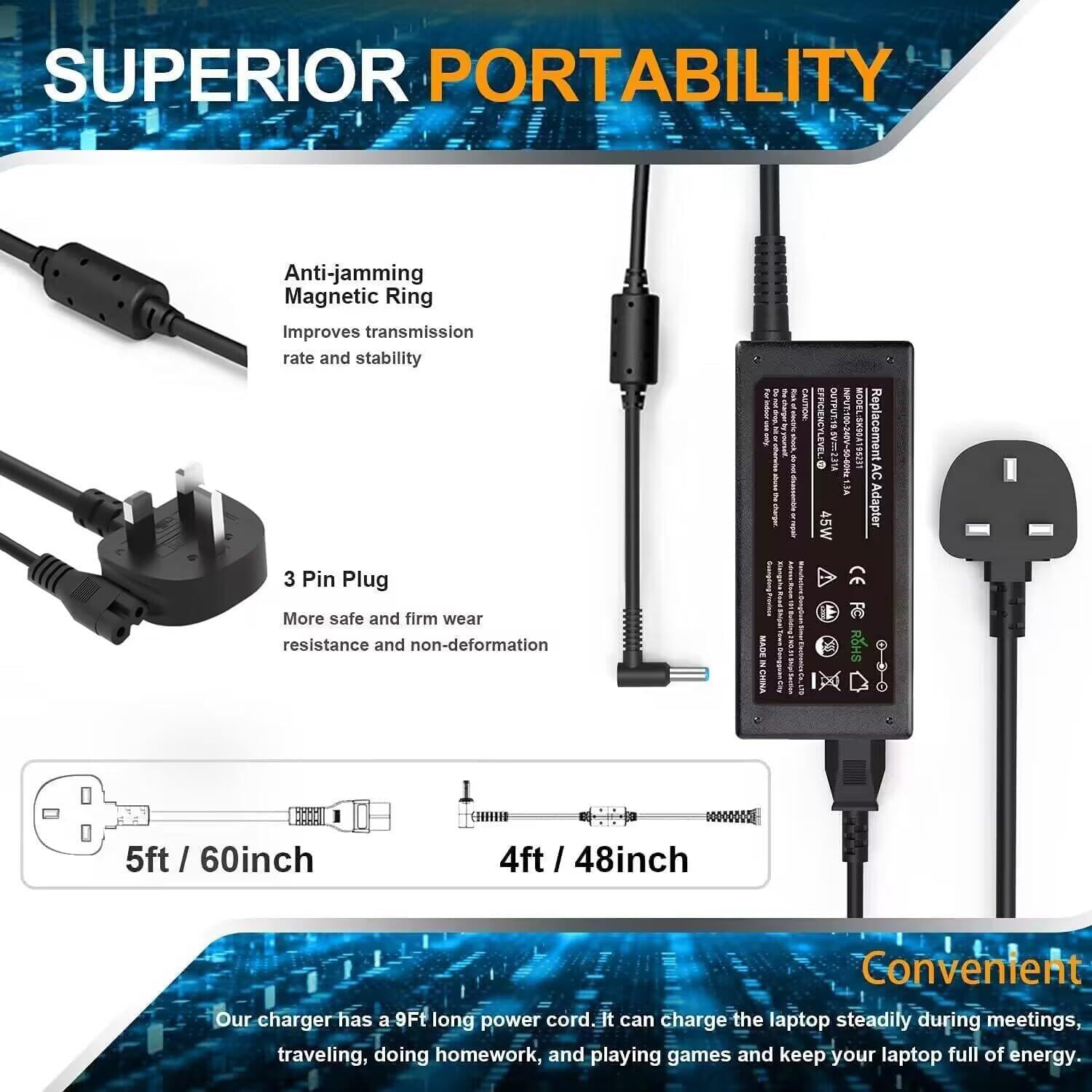 - Specifications: Input: 100-240V 50/60Hz; Output: 19.5V 2.31A 45W; Connector Size: 4.5mm*3.0mm Blue Tip; Compatible with 45W HP Laptop; Package: 1x Ac adapter & 1x Ac power cable(UK Plug)