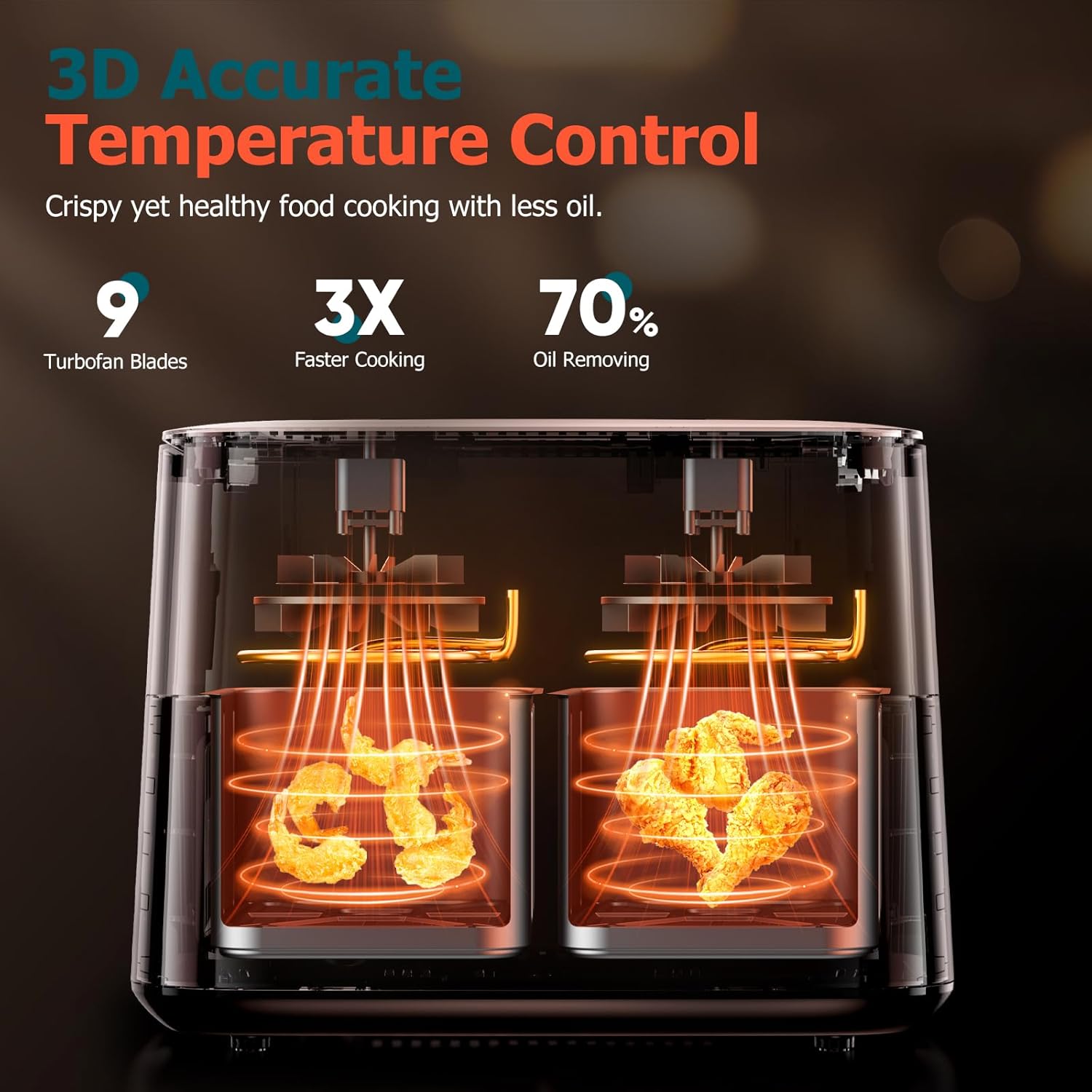 - 🍰🍰 【3D Heat Circulation for Healthier, Faster Cooking】The dual air fryer uses advanced 3D heat circulation technology, cooking food up to 40% faster than traditional ovens while ensuring an even, crispy finish with up to 70% less oil. Achieve healthier, golden brown results every time, sealing in flavor without sacrificing crispiness.