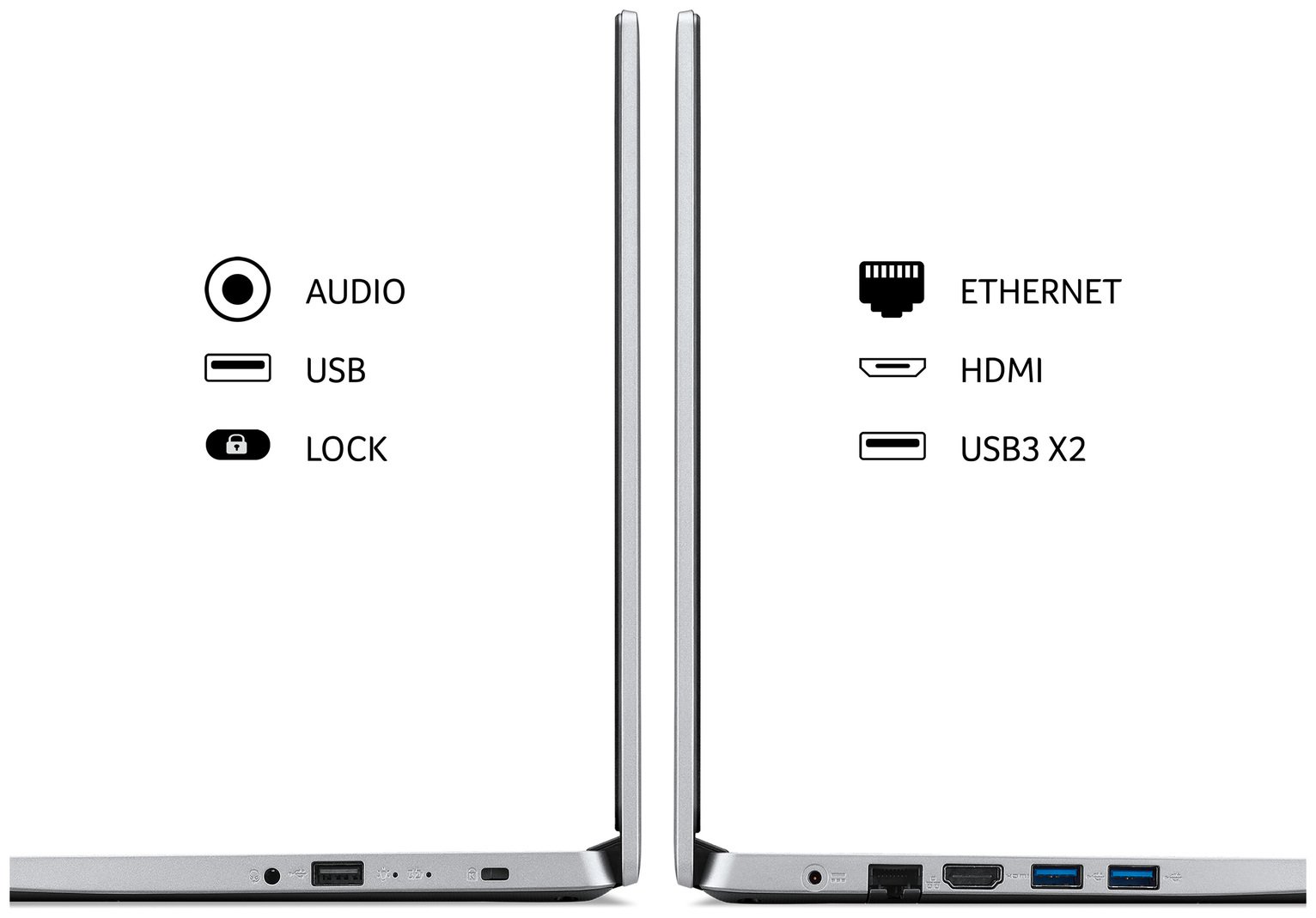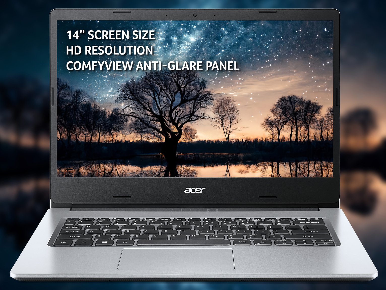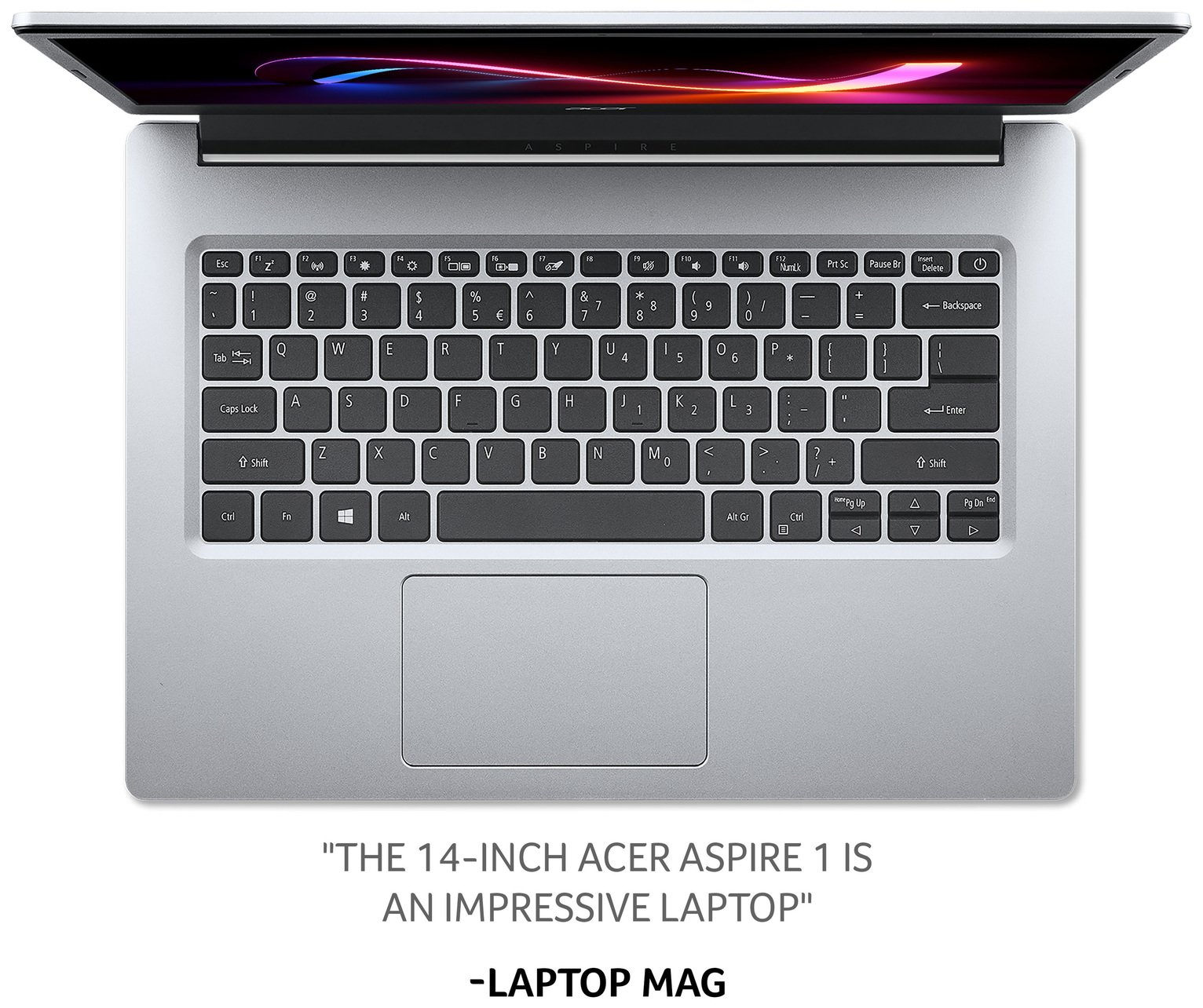 - Box Contents: Aspire 1 Laptop, 45W 3-Pin Charger, Setup Guide.