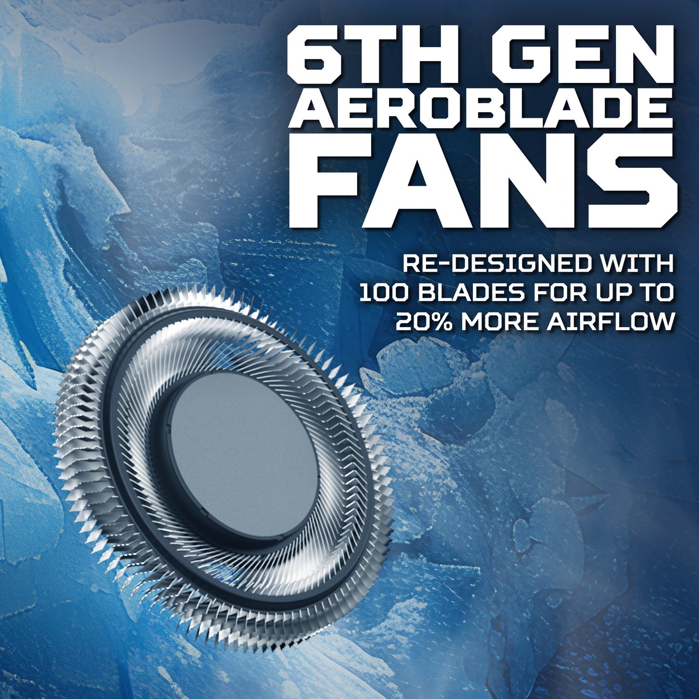 6th gen AeroBlade 3D fans – The 100 metal blades feature an adaptive blade design that changes shape to optimise airflow depending on the fan speed, providing up to 20% more airflow than standard fans.