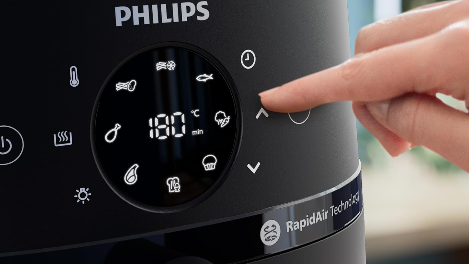 - Touchscreen control with 9 presets: Choose from frozen fries, fresh fries, chicken, meat, fish, breakfast, vegetables, cake, keep warm
