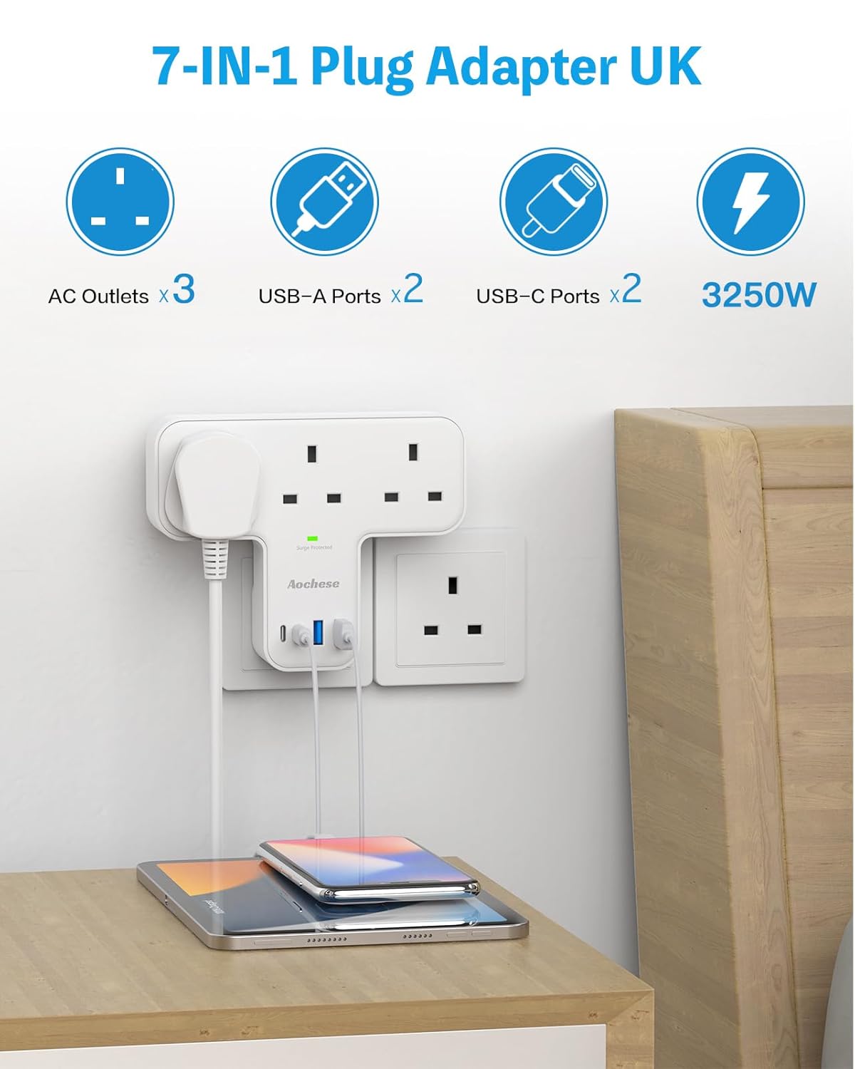 Aochese Multi Plug Adaptor, 7 in 1 Plug Extension Socket 3 Way 4 USB Ports, Power Extender Wall Adaptor for Household Appliances, Iphone, Smartphone, Tablet, Home, Office,…