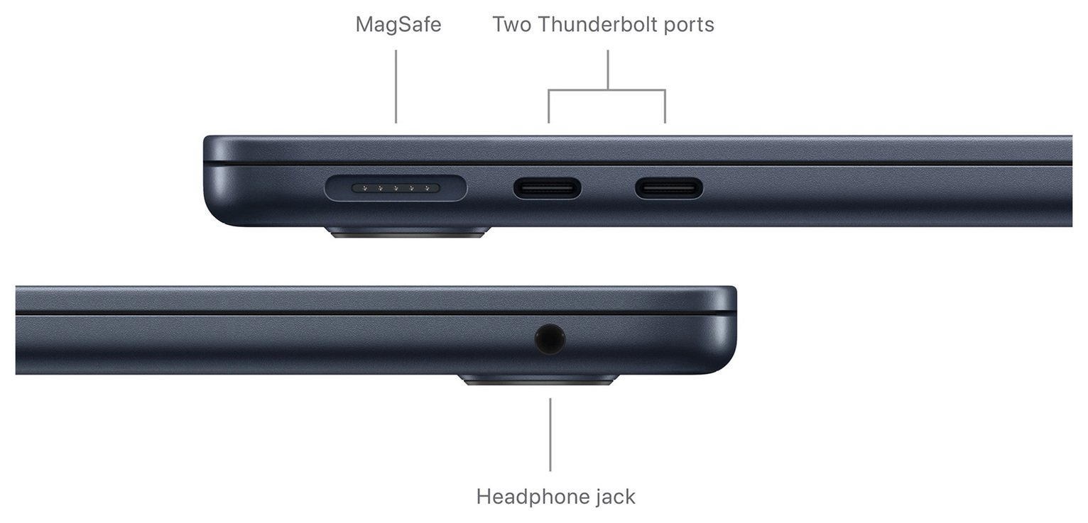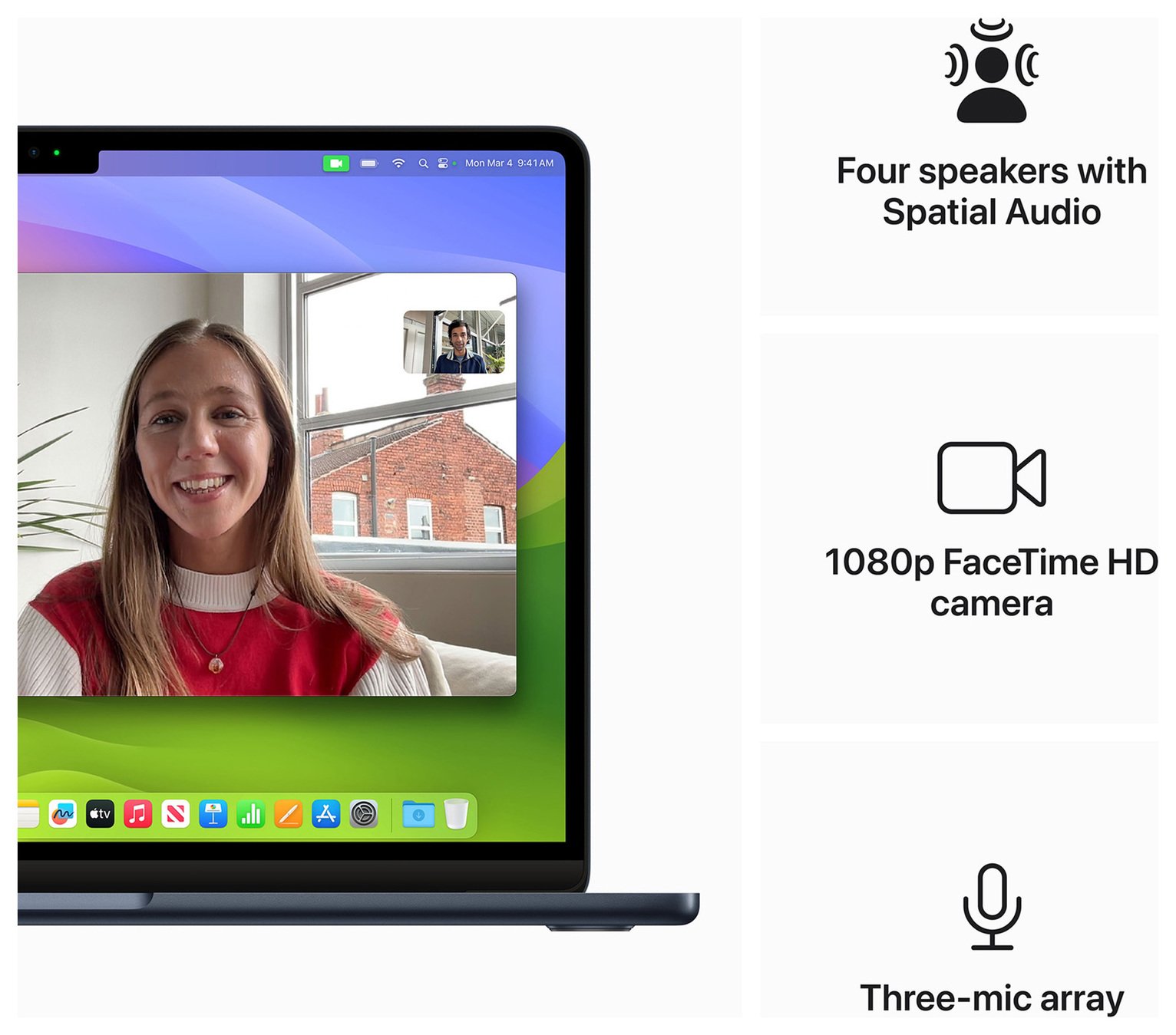 A Chipload of Power. The moment you open your MacBook Air, it’s ready for whatever you throw at it. And no matter how intense the workload, it stays silent thanks to a fanless design. The MagSafe charging cable easily attaches and detaches with magnets, preventing any unintended flights. Two Thunderbolt ports let you connect high-speed accessories and charge your Mac. Look Sharp, Sound Great with a 1080p HD camera, three mics, and six speakers with Spatial Audio.
