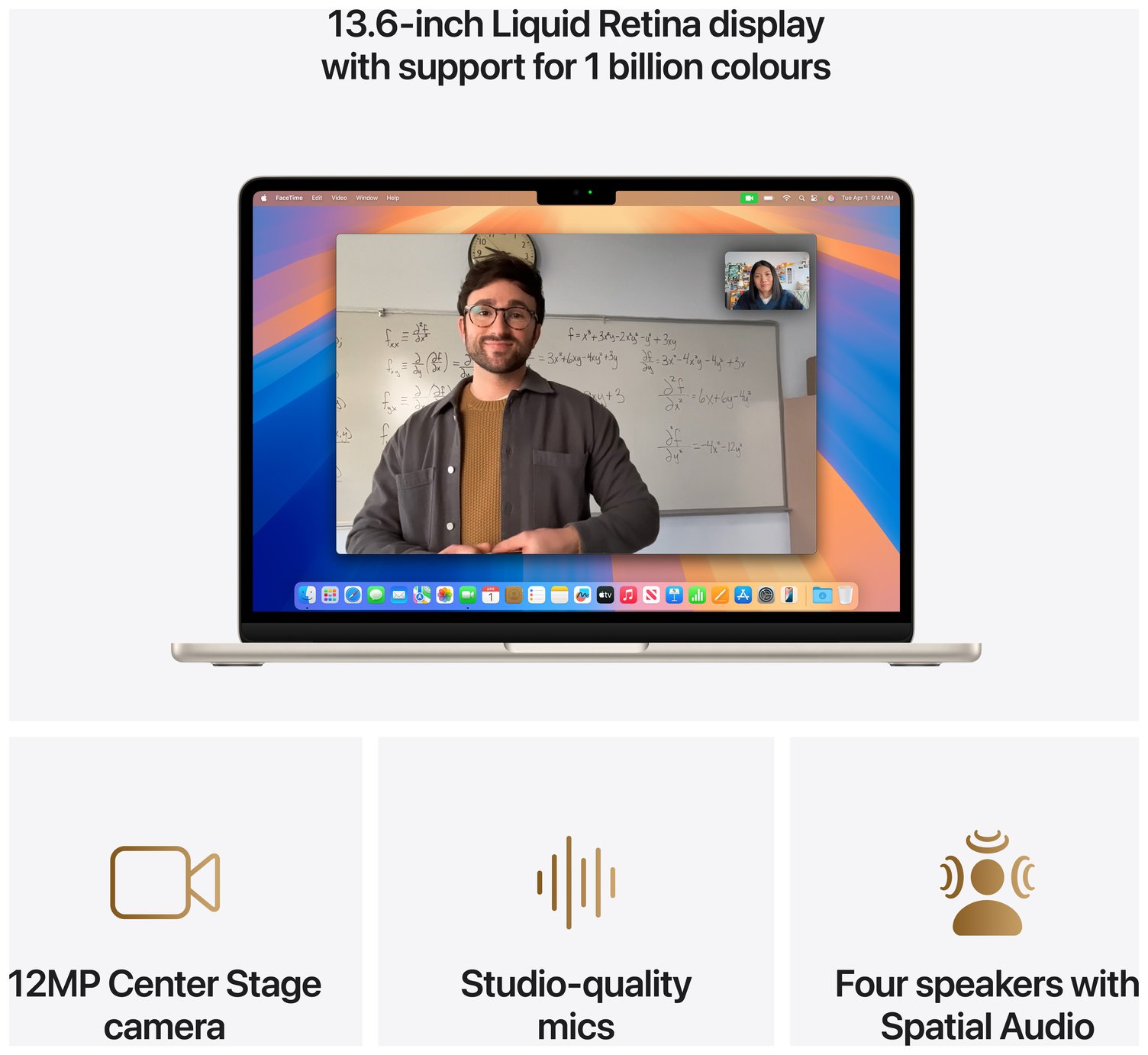 LOOK AND SOUND YOUR BEST – Everything looks and sounds amazing with a 12MP Centre Stage camera, three mics, and four speakers with Spatial Audio. CONNECT IT ALL – MacBook Air features two Thunderbolt 4 ports, a MagSafe charging port, a headphone jack, Wi-Fi 6E and Bluetooth 5.3. And it supports up to two external displays.