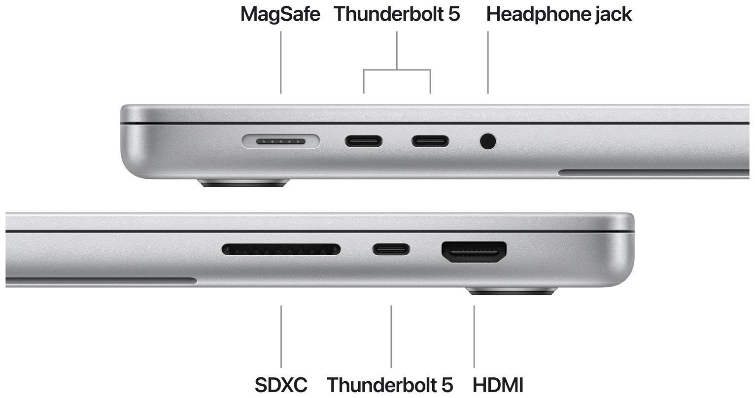 CONNECT IT ALL – The 16-inch MacBook Pro features three Thunderbolt 5 ports, a MagSafe 3 charging port, SDXC card slot, HDMI port and headphone jack. And it supports up to two external displays with M4 Pro, or up to four with M4 Max. PRIVACY AND SECURITY ARE BUILT RIGHT IN – Every Mac comes with robust defences against viruses and malware. If your Mac is lost or stolen, Find My can help you get it back. FileVault makes sure your files are encrypted so others cannot access them. And free security updates help keep your Mac protected.