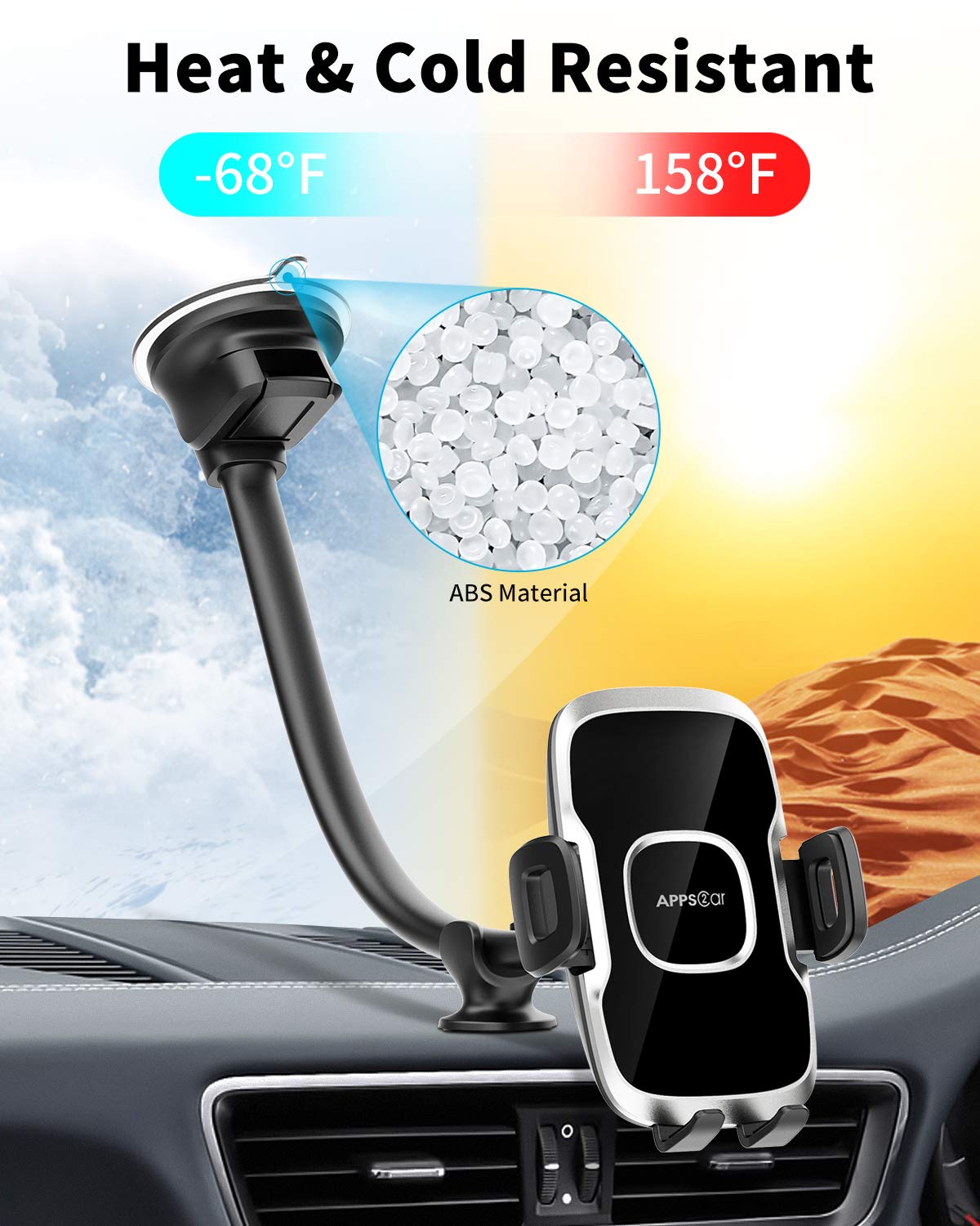 - 【Strong Suction 】: The extra long arm phone holder has strong suction with switch, well adhere to windshield/dashboard. And extra-dashboard support base offers more stability and security, preventing phone from falling off while driving. Long arm for better extension with sturdy suction cup base: industrial-strength suction cup, securely lock your mount/device on the window/windshield/dashboard even on the bumpiest roads.