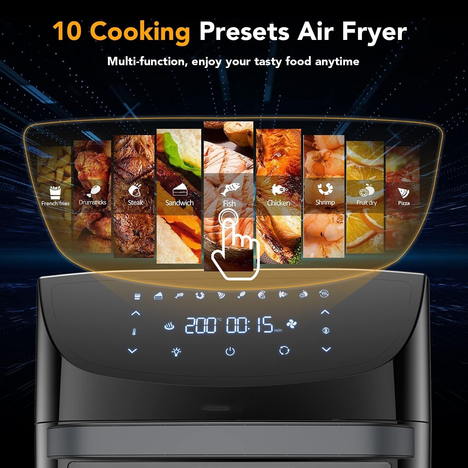 - 【All-in-One Machine】This 18L air fryer with 1,800W power offers 10 modes for versatile cooking options, including Steak, Chicken, Seafood, Shrimp, Bacon, Frozen Foods, French Fries, Vegetables, Root Vegetables, Bread, and Desserts. It allows you to air fry, bake, grill, roast, toast, dehydrate, and rotisserie. The transparent glass window makes it convenient to monitor the cooking process.