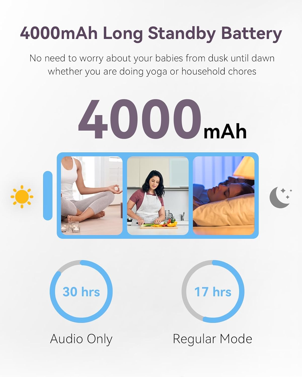 - 【Up to 17 Hrs. Video Streaming or 30 Hrs Audio mode on Single Charge】: With 4000mAh rechargeable battery you can get up to 17 hours of video streaming or up to 30 Hrs of Audio only, allowing you to easily monitor your baby throughout the night or full day on one charge.