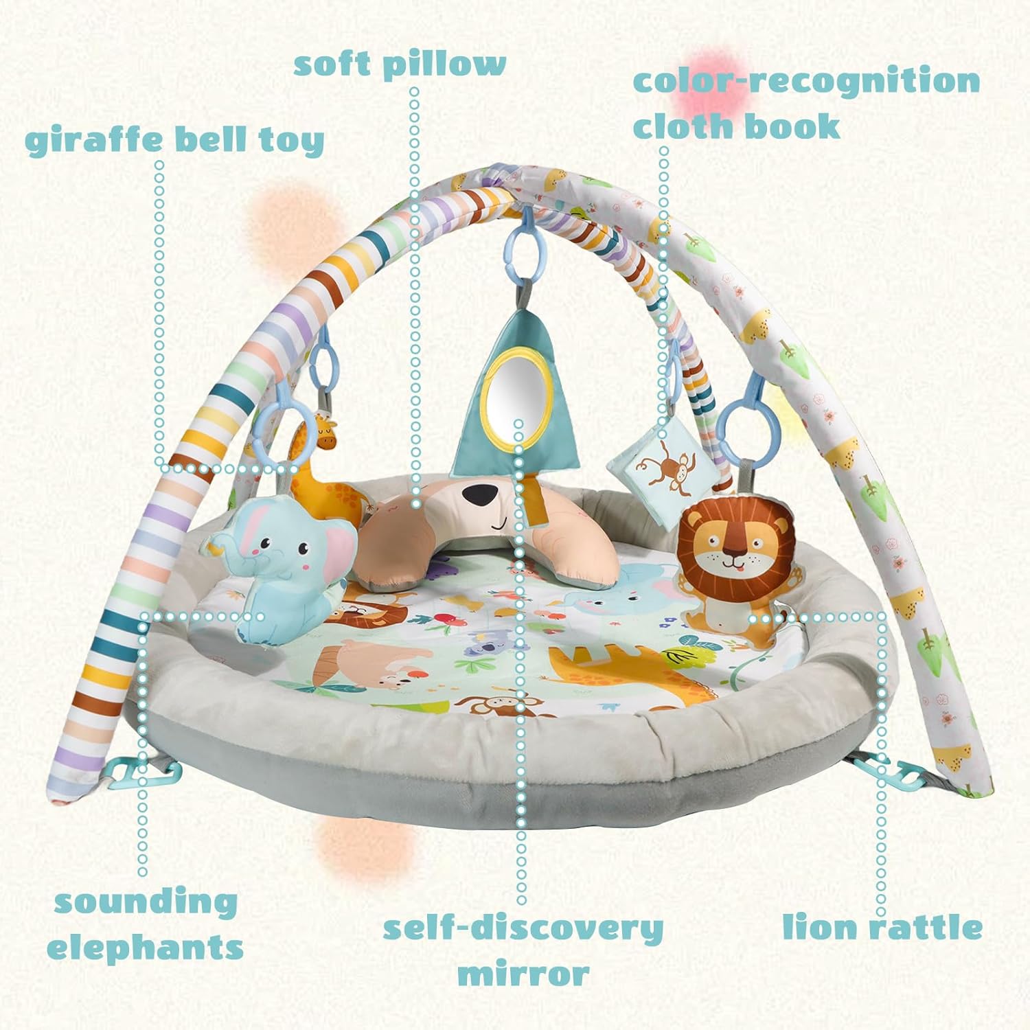 - Comprehensive Early Development:Our baby gym helps babies improve their early educational development motor and cognitive skills with 6 removable baby toys including elephant, giraffe, lion, moon pillow, animal fabric book, self discovery mirror. The baby toys make sounds when grasped, shaken or pressed, which stimulate visual, auditory, tactile, cognitive and physical coordination and stimulate baby’s curiosity, and the self-discovery mirror allows baby to discover and recognise themselves in the mirror, promoting visual and cognitive development. This multi-functional baby mats for floor play will bring endless fun to your baby as he or she grows from a newborn to an active toddler.