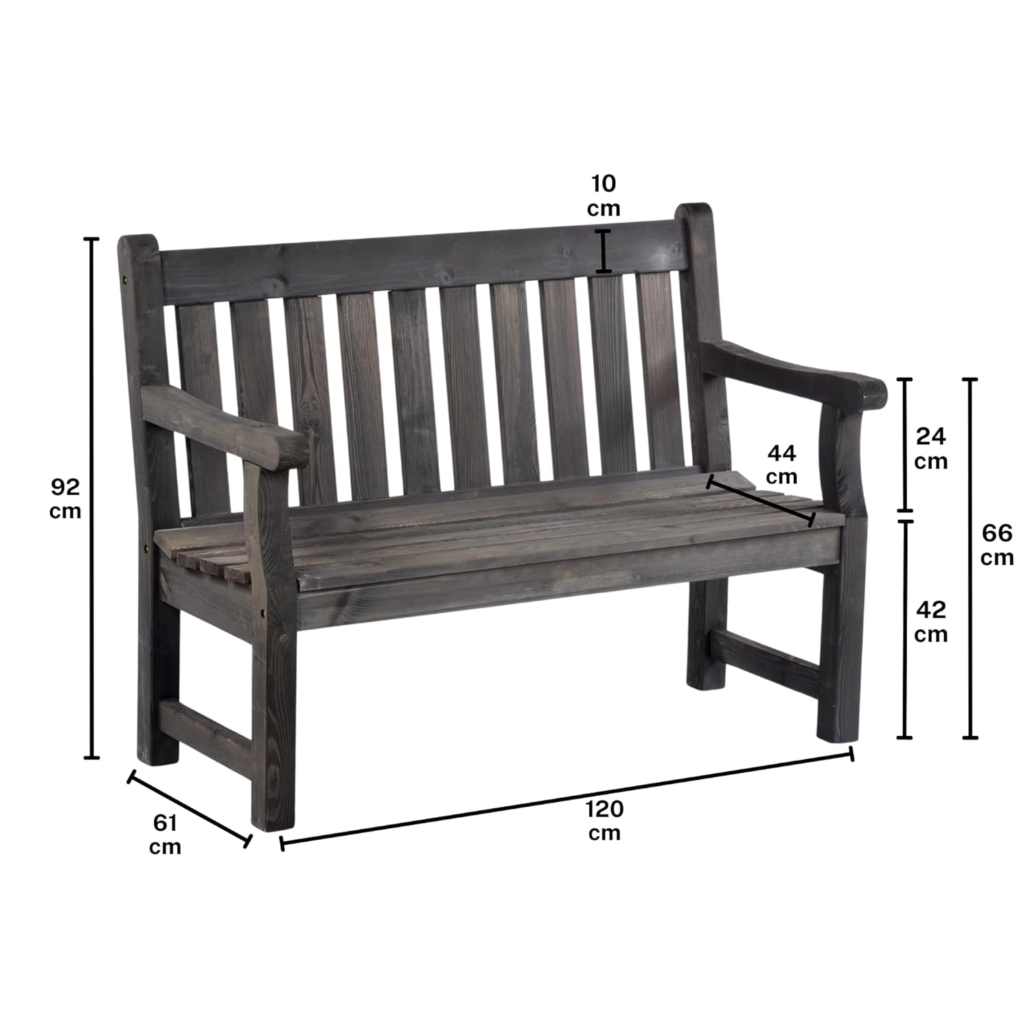 - TREATMENT – The colour on this bench is a dark grey wash added to the treatment NOT a paint. Natural knots in the wood can affect the dark grey wash distribution. Due to it’s natural uneven coverage, the dark grey wash therefore allows some of the wood grain to be visible across the product.