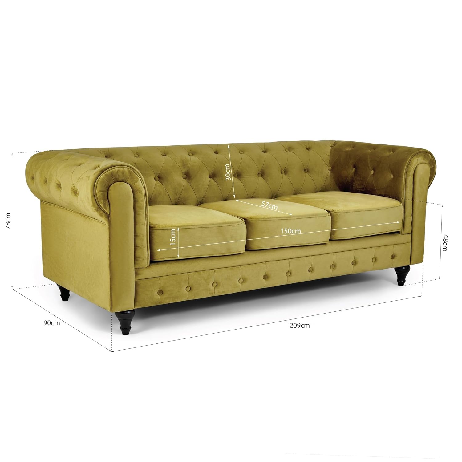 376 reviews for Bravich Velvet Chesterfield Sofa- Gold. 3 Seater Settee, Soft Plush Fabric Couch. Living Room Furniture, Easy Clean. 3 Seater- 209cm x 90cm x 78cm