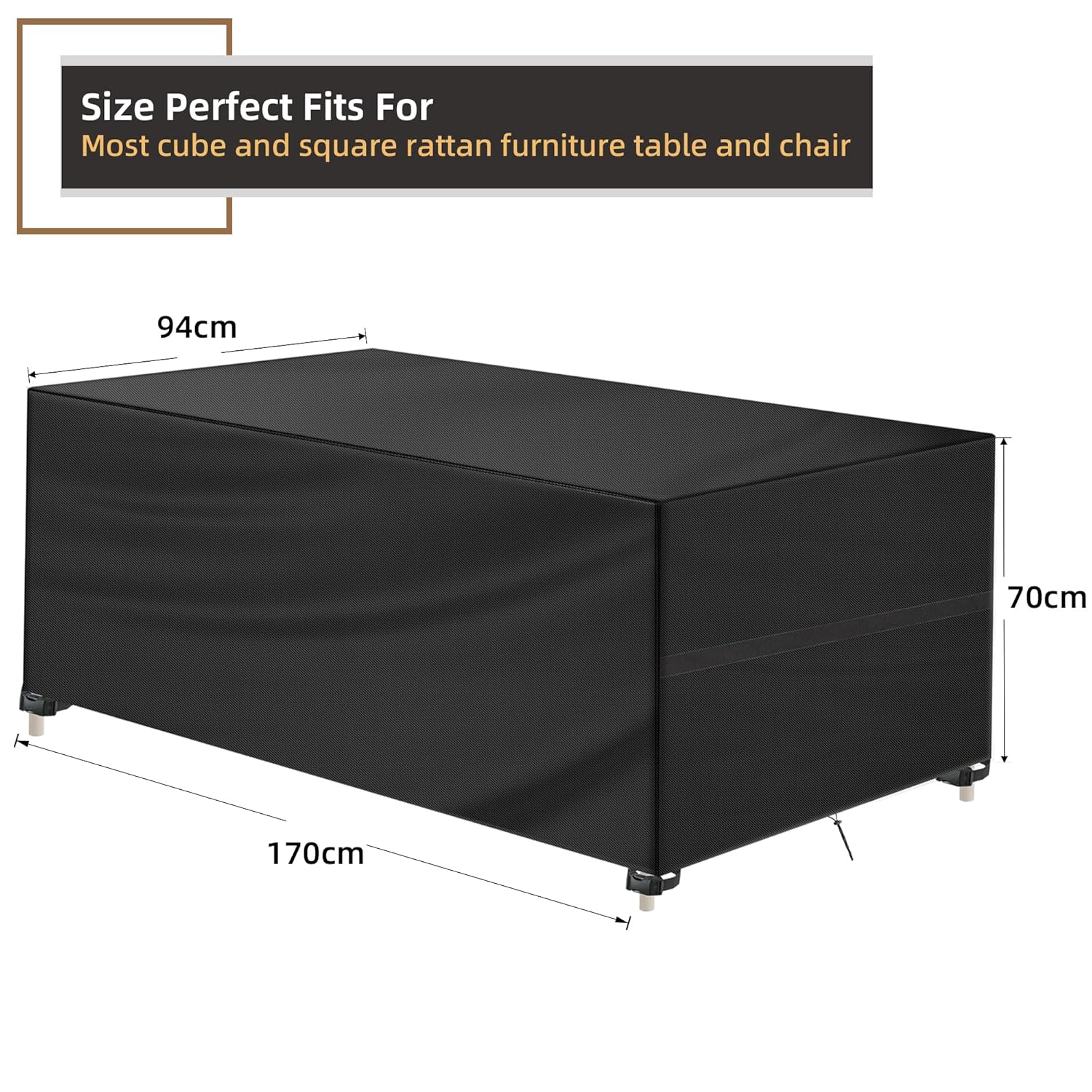 - [ Size Fits ]- This patio table cover size is measured by Length x Width x Height, it is wide Compatibility and suitable for outdoor most shape furniture set, picnic coffee table, dinning set, chairs, bbq table, motobike, benches and sofa in rectangular cube sqare or roud. Please check your furniture dimension is same or less than 2cm of the cover’s size before place order.