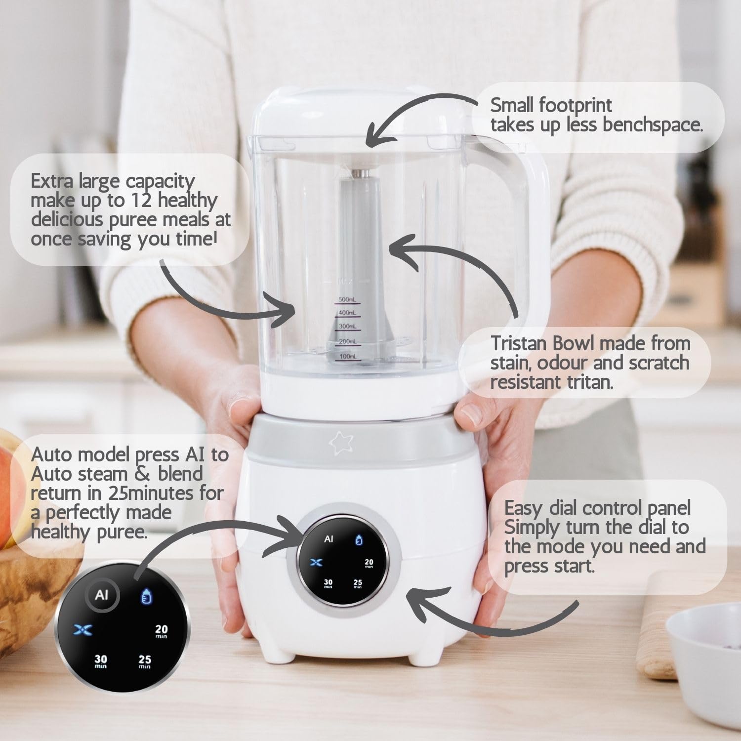 - STEAM & BLEND: Baby food blender that automatically steams, then blends, with pulse blending technology for control over consistency and texture. Multifunctional baby food Maker, ideal for easily preparing fresh, healthy meals for your little one.
