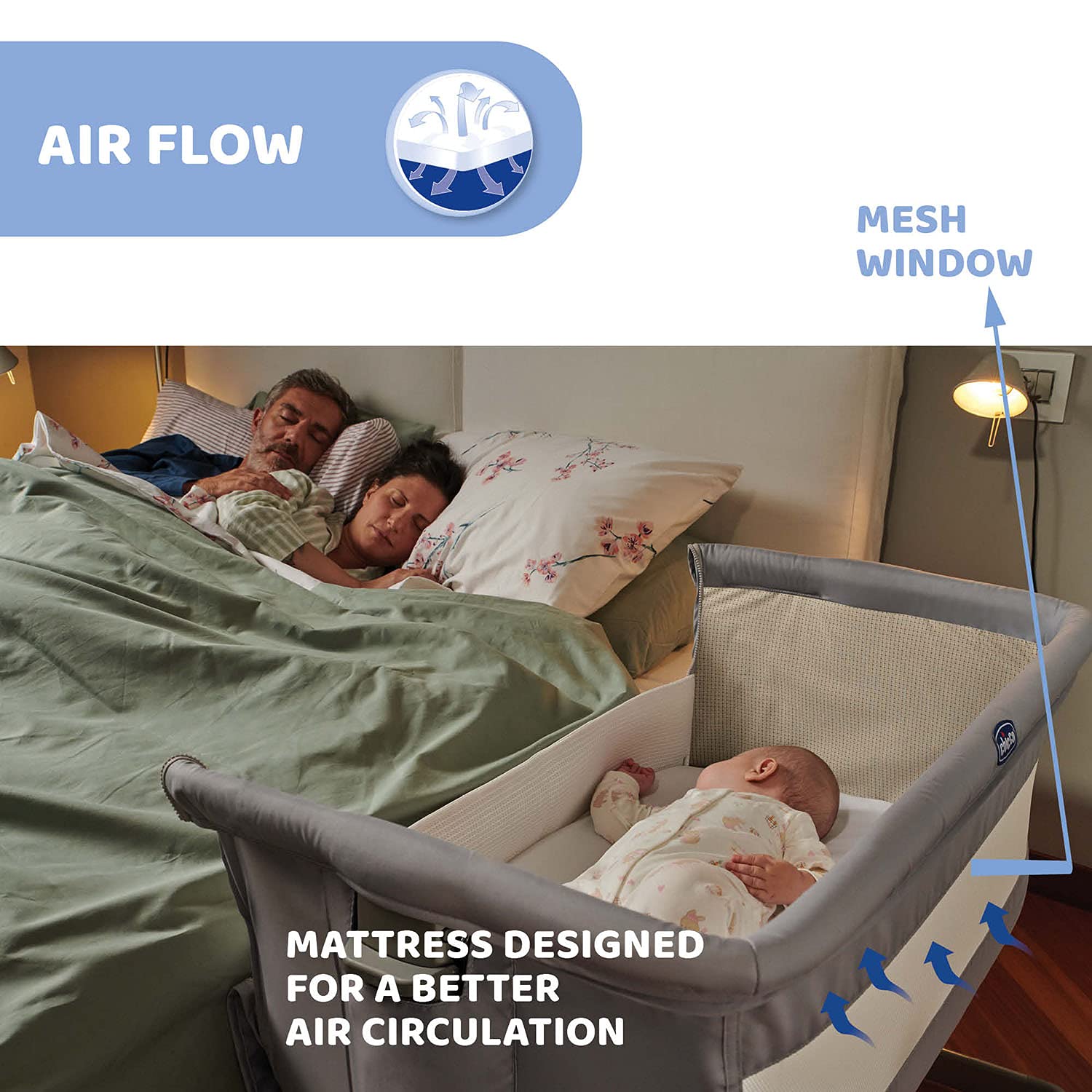 - TILTABLE AND AIR FLOW: Chicco Next2Me can be tilted to help the baby in case of nose congestion or regurgitation, as many pediatricians suggest to tilt the crib to benefit of an anti-reflux effect. The breathable mesh window ensures a better air circulation inside the crib.