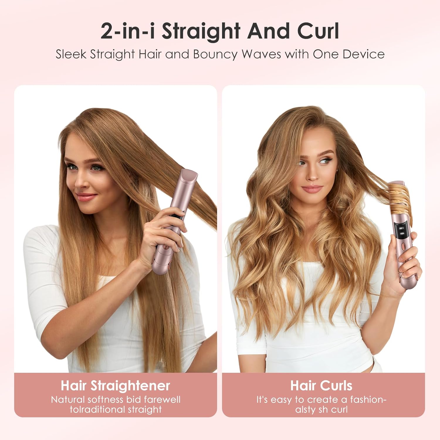 - 【2 in 1 Hair Straightener and Curler】The hair straightener and curler is versatile and suitable for various hair types and styles. Whether you have straight or curly hair, this cordless device can effortlessly achieve the desired look. The high-quality ceramic plates ensure even heat distribution to prevent hair damage and reduce static electricity, resulting in smooth and shiny hair.