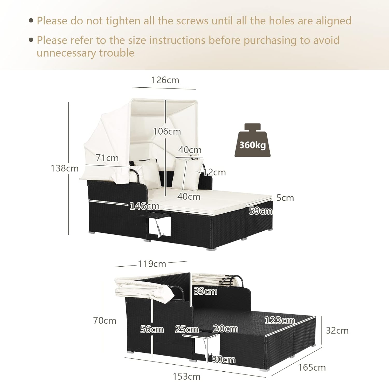 - 【Retractable Canopy & Folding Side Tables】This outdoor daybed features a retractable canopy with fixed ropes that allows you to read and rest under the shade or just enjoy the sunbath. When the canopy is retracted, it needs to be fixed with ropes. Likewise, the side tables on both sides are retractable as well to make needed close to hand. All you need to do is use the pneumatic rod for safe and easy adjustment.