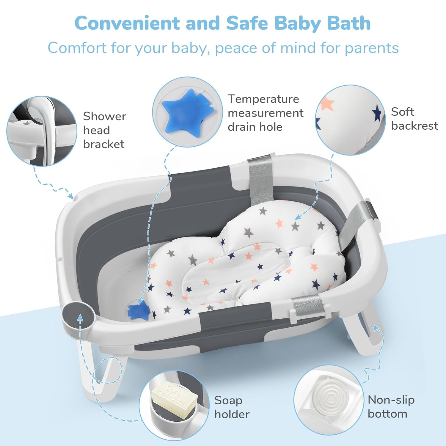 DEANIC Baby Bath Tub for 0-6-12 Months Newborn, Foldable Toddler Bath with Soft Cushion Pad, Portable Baby Bathtub Travel Save Space (Grey)
