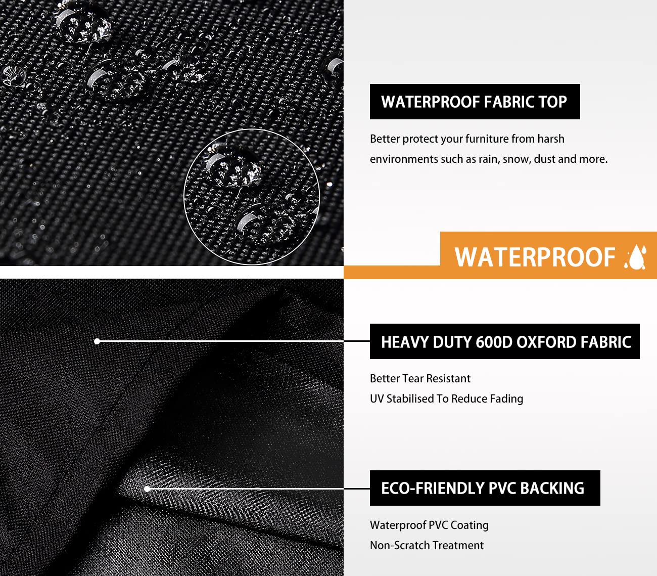 - 【Heavy-Duty Material】- Made from 600D PVC-lined oxford fabric. Denier is a unit of weight for fabric, higher denier means thicker, heavier, more sturdy and durable fabric. Comparing with 420D cover, 600D cover performances better at all aspects, it’s more waterproof, UV-resistant, tear-resistant, fade-resistant etc..