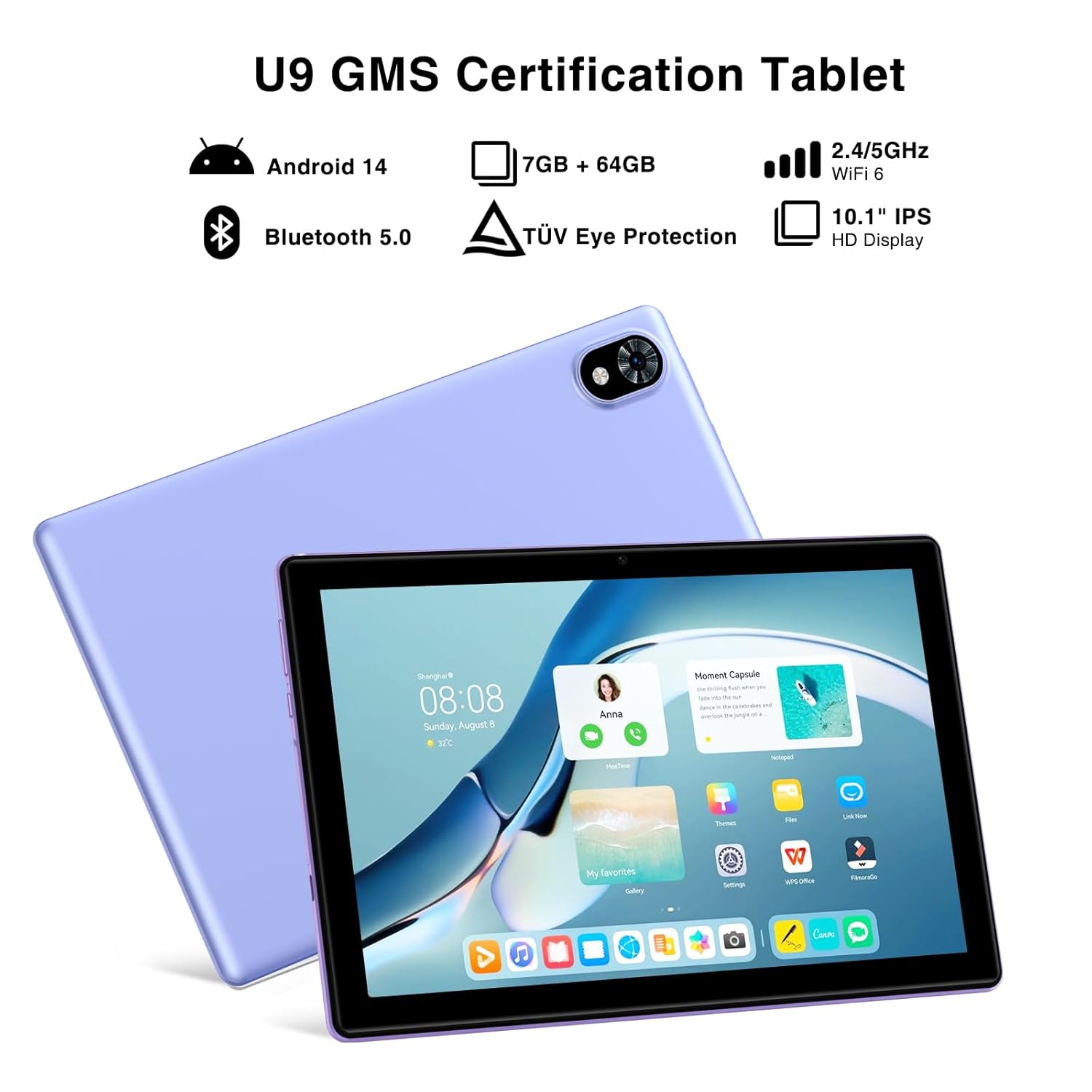 - 【Latest Android 14 Tablet】This U9 tablet is equipped with the latest Android 14 system and a 2.0 Ghz quad-core processor, which not only generates low heat and consumes low power, but also operates more gently and quickly, which greatly improves the efficiency and convenience of using the tablet. The Android 14 has upgraded personal privacy protection and security.