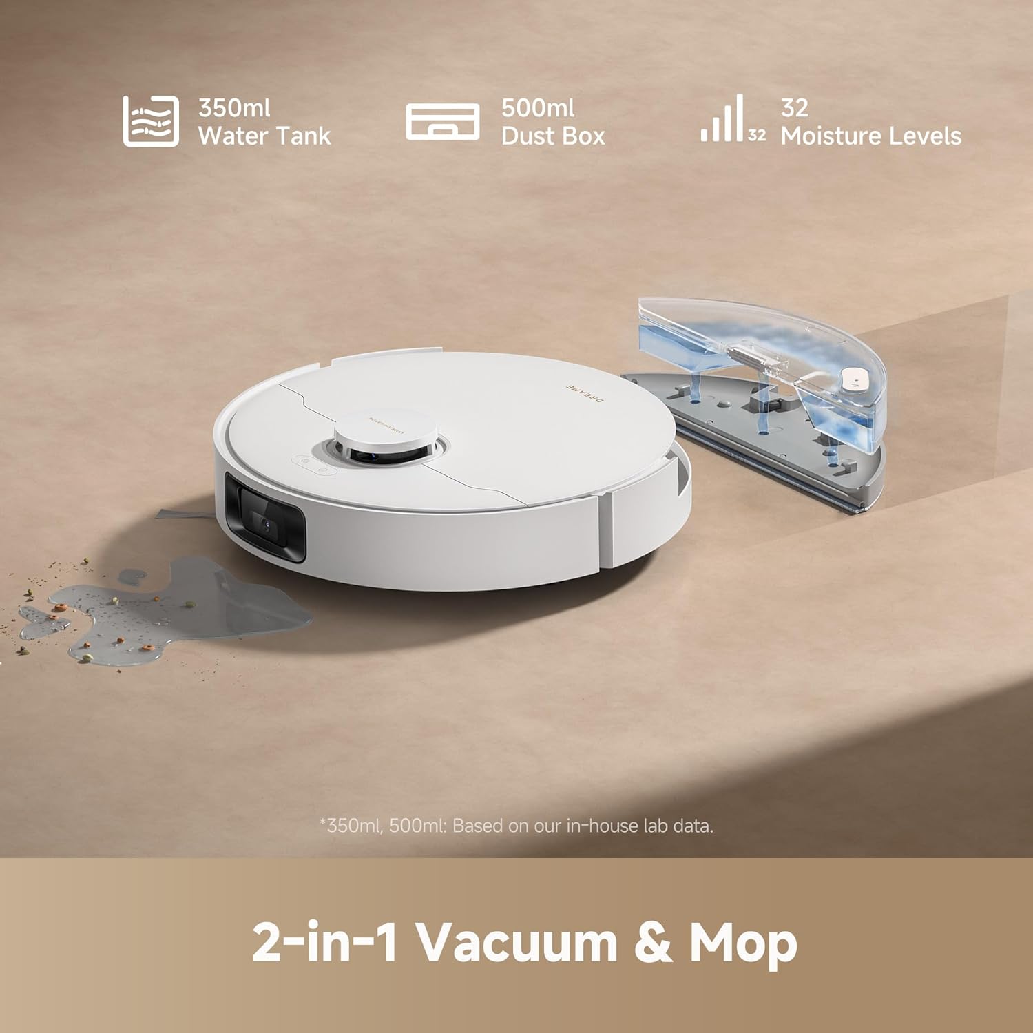 - Vacuum and Mop in One Go: Tailor moisture and suction levels with D20 Pro Plus’ 2-in-1 cleaner. The spacious 500ml dust box holds dirt securely, while the 350ml clean water tank features 32 moisture levels for tailored mopping, streamlining your cleaning routine