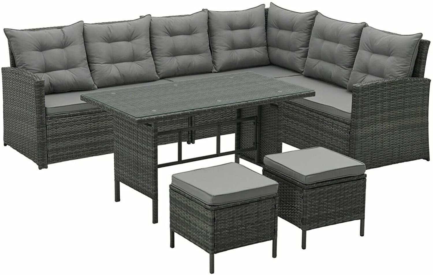 - Enjoy at your leisure: One three seater, one two seater, one corner unit, two footstools and one dining table, you’ll never want to sit indoors again. The Evre Monroe can be used with or without the dining table for you to enjoy day after day. This set is perfect for eating all of your meals, putting your feet up with a good book, or even working from home you and your family will struggle to not find something it’s perfect for