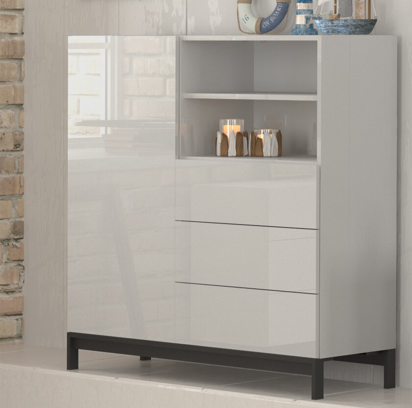 This highboard presents a modern chest of drawers, which scores with many details. The intelligent division allows plenty of storage space. As for stylish decoration, this dresser is the perfect place where photos, flower vases, and books can be perfectly staged. The manufacture of FSC-certified wood-based material and the legs made of metal ensure easy-care handling and a great look. This versatile piece of furniture is particularly well suited for small spaces, as it offers plenty of storage space, yet is compact. A practical and timeless masterpiece that also comes with push-to-open drawers and doors. Latitude Run Colour: Glossy White