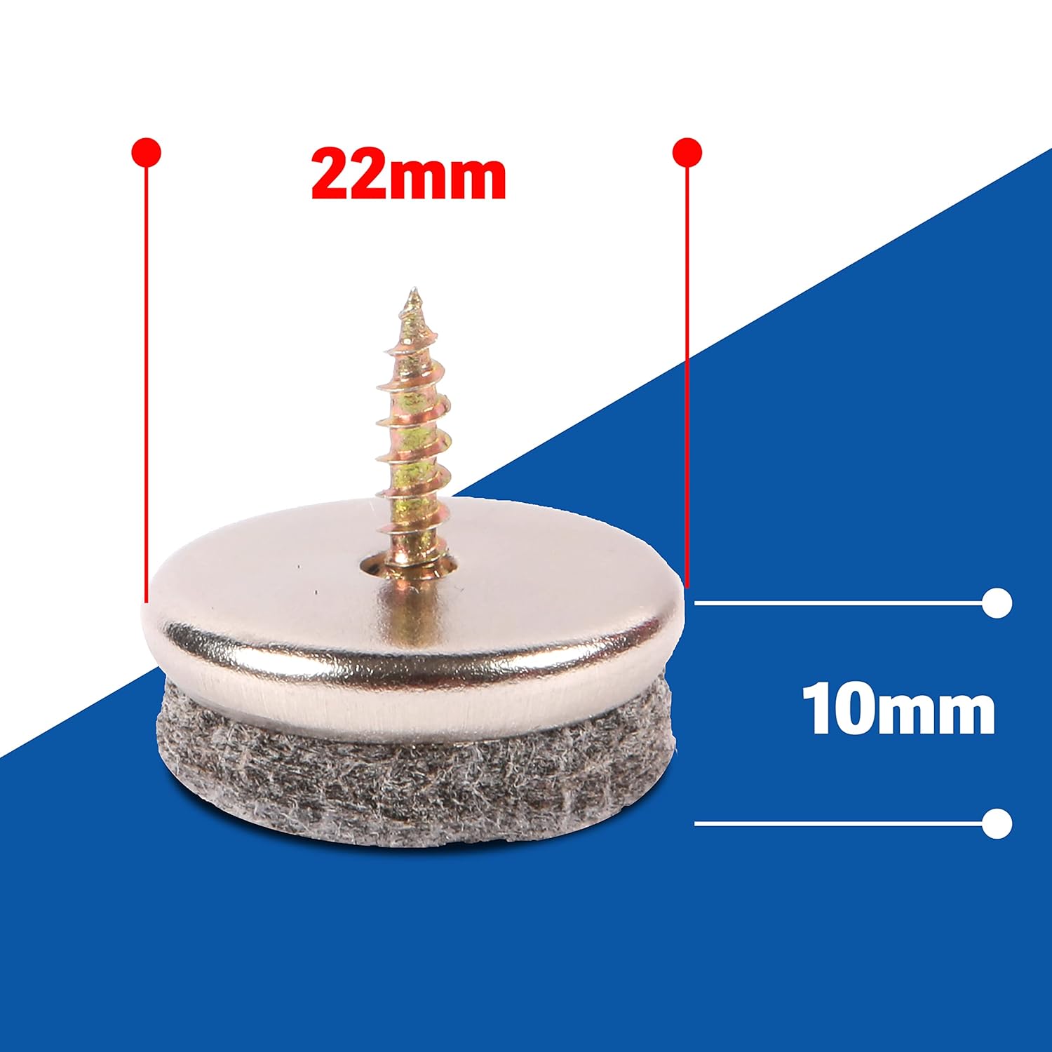 - High quality felt glider screws. Carbon steel screws (1.58 cm) with the correct length, wax-coated, course double thread and thin shaft for quick insertion and prevent wood splinters