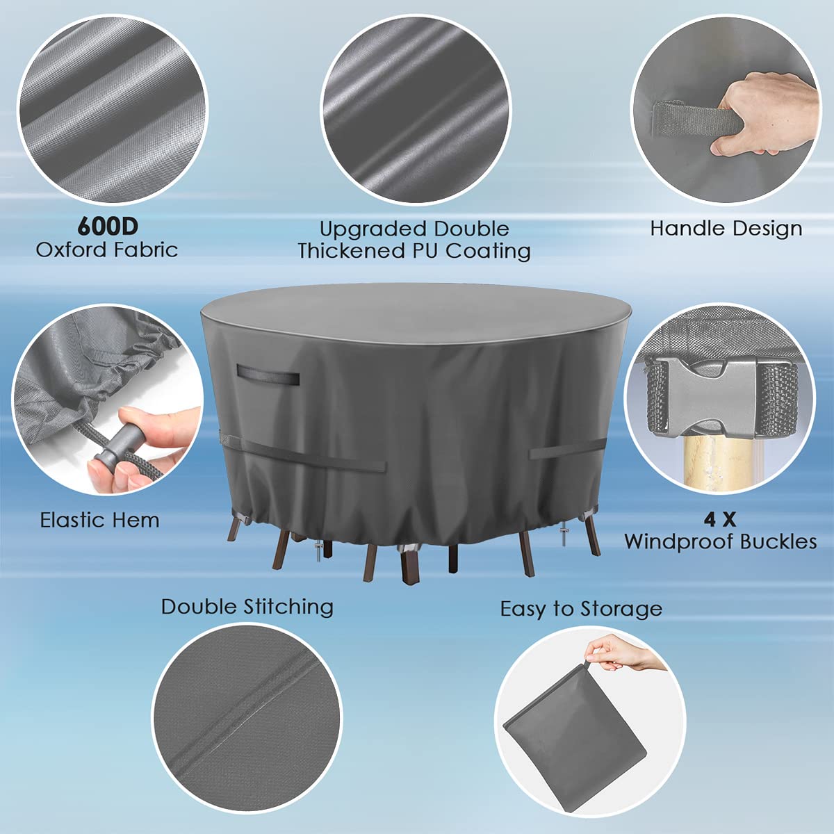 - ✔ UPGRADED WINDPROOF DESIGN — We added extra fastening straps to the sides of this round outdoor table cover to help tighten the cover, no more worries about your patio table cover blowing away in strong winds! There is also 4 drawstrings on the edge of the round patio furniture cover so you can adjust the looseness as needed. The 4 buckles on the bottom of the cover can also help you fasten the cover securely to the furniture legs.