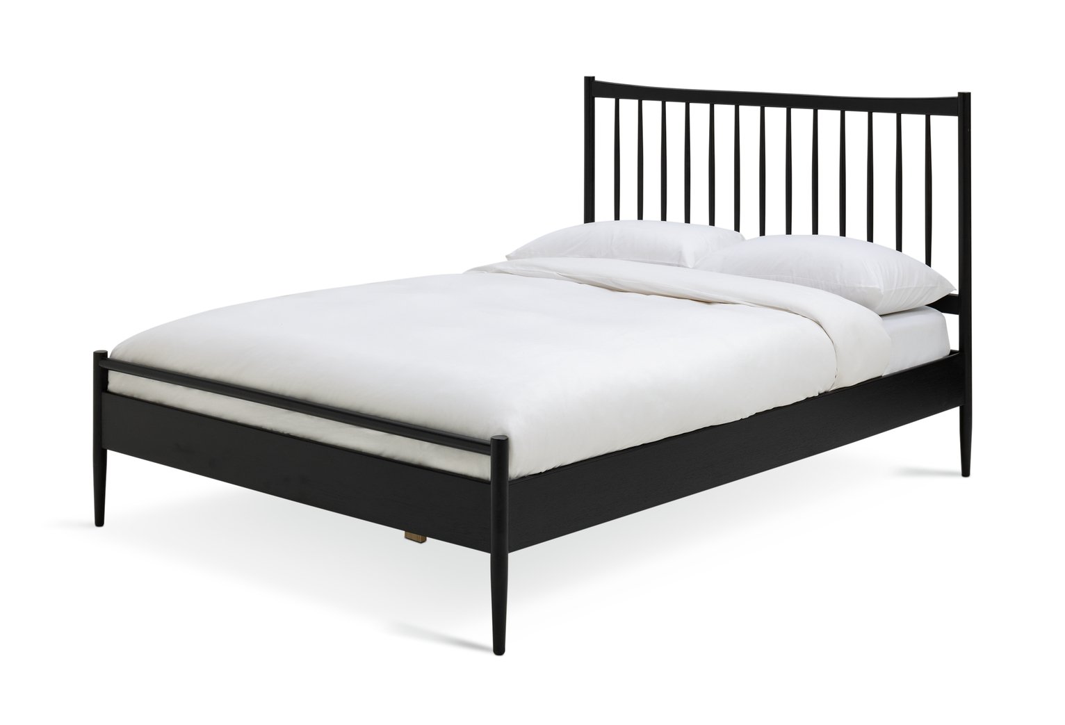 Inspired by modern Scandinavian design, our bedframe is crafted from solid wood with a beautiful black stained finish. We love the simplicity of the headboard, made from wood-turned spindles and the carved top and bottom bar, which are elegant but strong. Elevated from the floor, you even have room for a little underbed storage. This solidly constructed base has sprung wooden slats for mattress aeration, support and comfort. Part of the Chiltern collection. Wooden frame. Base with wooden slats. No storage. Size W159, L209, H110cm. Height to top of siderail 35cm. 20cm clearance between floor and underside of bed. Weight 36kg. Self-assembly – 2 people recommended. Package Dimensions:Package 1 dimensions: H11, W165.5, D117.5cm. Package 1 weight: 24kg. Package 2 dimensions: H10, W208.5, D27.5cm. Package 2 weight: 12kg. General Information:By choosing FSC certified products, you are supporting responsible management of the world’s forests. Manufacturer’s 1 year guarantee.