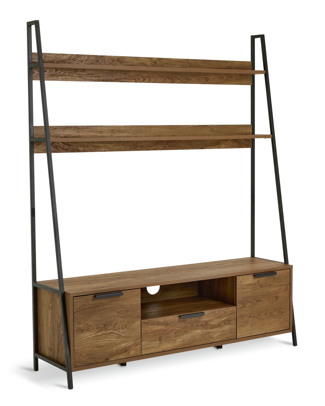 Tap into industrial chic with the Nomad media unit. Created in an oak-style finish with dark metal accents, it’s an eye-catching piece of furniture. Designed with 2 roomy cupboards in the base plus a central dropdown door with cubby above for games and gadgetry. While 2 top display shelves give plenty of room for you to showcase ornaments, books, plants and more. Equipped to take up to a 55” TV, it really is a great all round entertainment centre show piece. Part of the Nomad collection. Made from MDF with a wood effect finish.Size H 186, W 152, D 42cm. Weight 49.5kg. 1 drawer with metal runners. 3 shelves. 2 doors. Black handles. 1 media storage section. Largest height of media equipment sections 17.3cm. Easy cable access. Suitable for screen sizes up to 55in. Maximum weight of TV 40kg. Self-assembly – 2 people recommended. Package Dimensions:Package 1 dimensions: H18.7, W160.8, D46.1cm. Package 1 weight: 52kg. General information:By choosing FSC certified products, you are supporting responsible management of the world’s forests. Manufacturer’s 1 year guarantee.