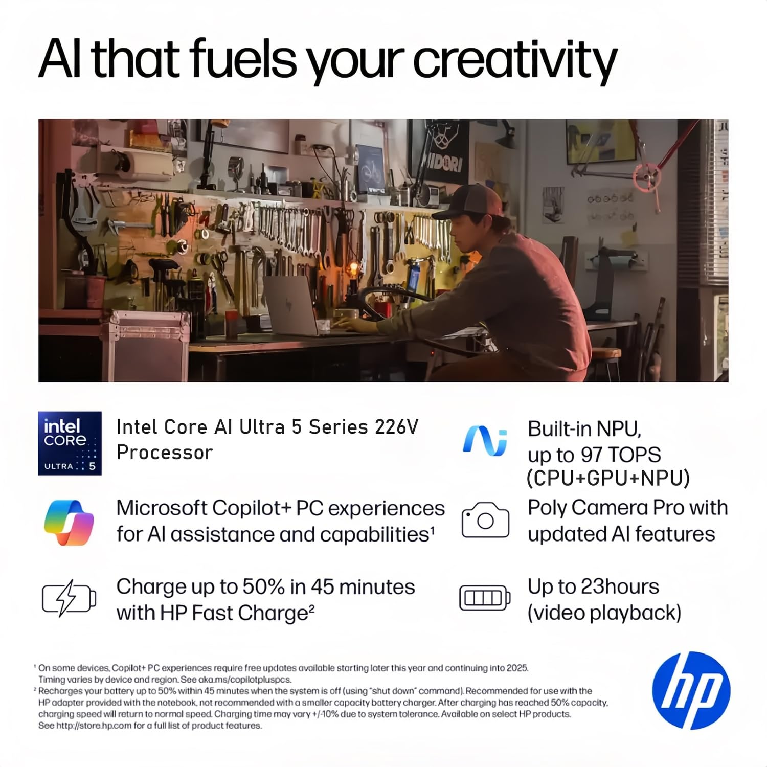 - All-Day Battery & AI-Enhanced Productivity: Work or play for up to 23 hours on a single charge. Leverage Copilot+ PC features and the HP AI Companion app for AI-powered tools like Paint Cocreator (text-to-image generation) and Live Captions (real-time subtitles) to boost creativity and efficiency