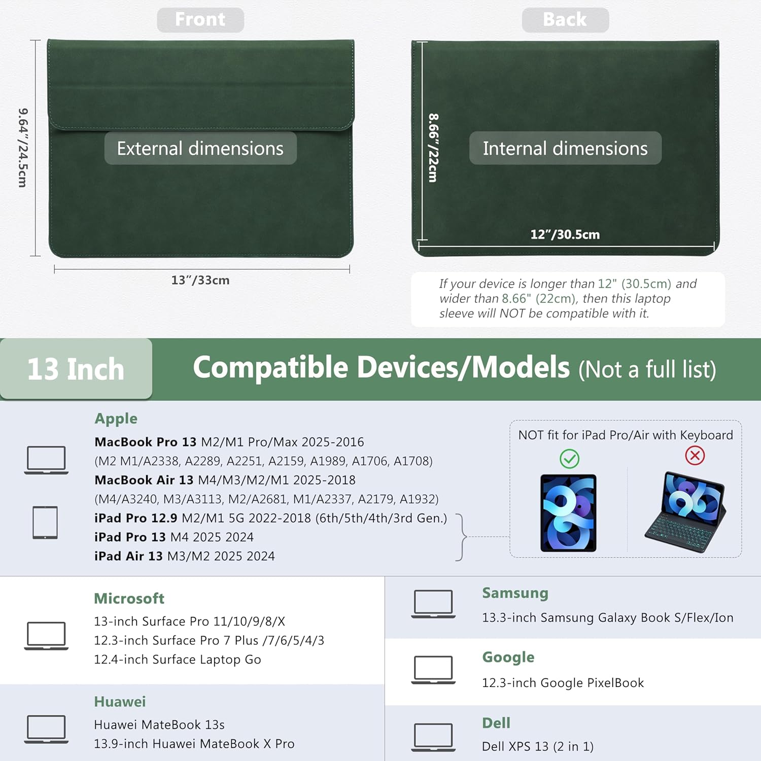 - Internal Dimensions: 12″ x 8.66″. Compatible with MacBook Pro 13 M2/M1 Pro/Max 2025-2016(A2338, A2289, A2251, A2159, A1989, A1706, A1708), MacBook Air 13 M4 M3 M2 M1 2025-2018(A3240, A3113, A2681, A2337, A2179, A1932), iPad Pro 13 M4 2024, iPad Air M3/M2 2025 2024, Dell XPS 13, Surface Pro 11/10/9/8/X/7+/7/6/5/4/3, 12.4″ Surface Laptop Go, iPad Pro 12.9 M2/M1 6th-3rd Gen. 2022-2018(without Keyboard), 13.9″ Huawei MateBook X Pro, Huawei MateBook 13s, 13.3″ Samsung Galaxy Book S/Flex/Ion, etc.