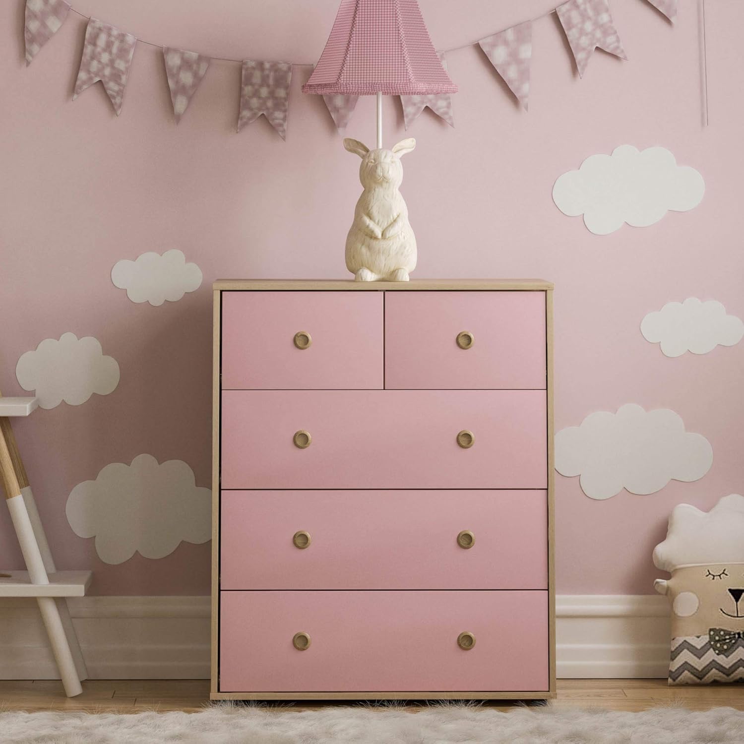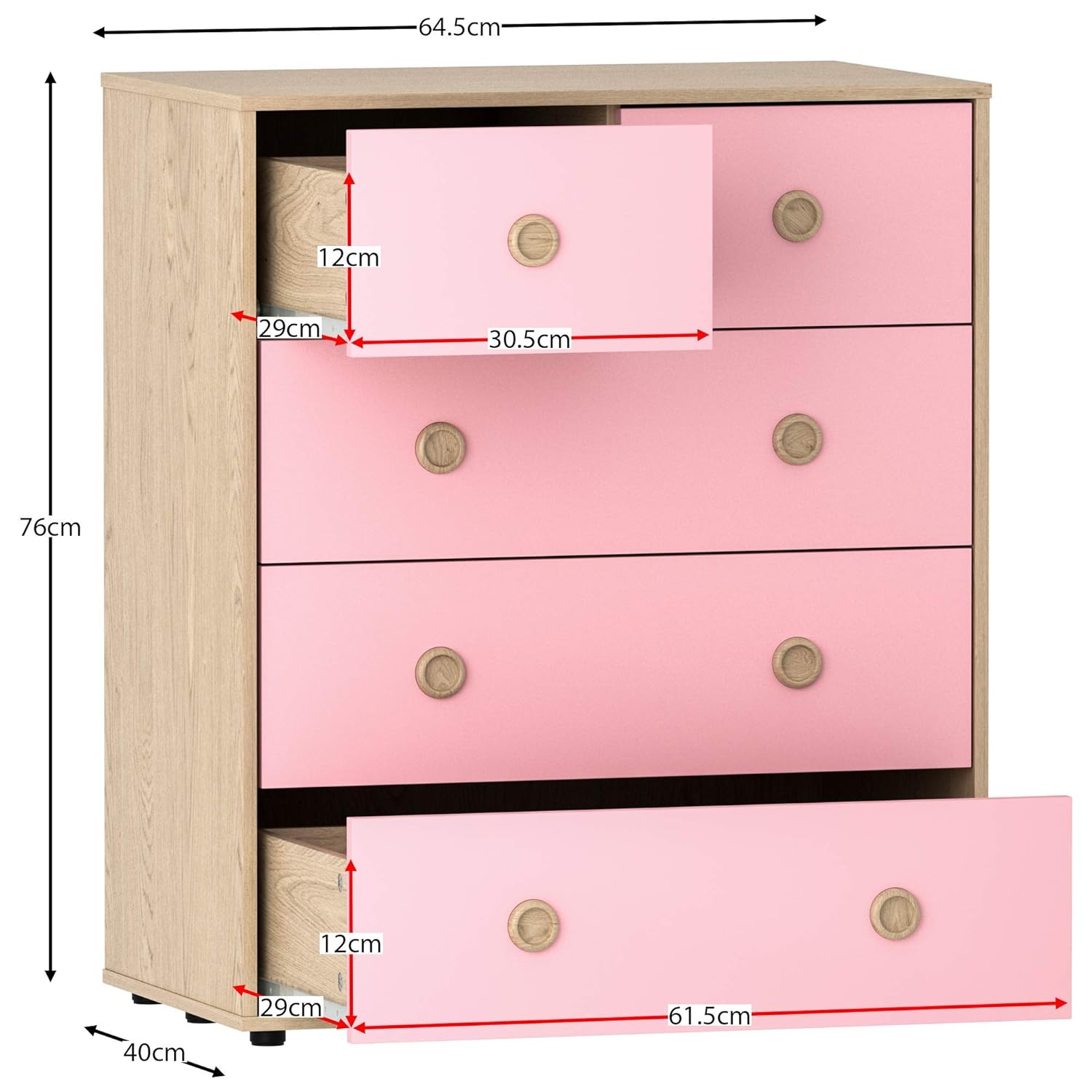 - Made from high-quality MDF and particle board, the Neptune 5 Drawer Chest in pink and oak is built to last. It can withstand the wear and tear of daily use, making it a practical and durable storage solution for your child’s bedroom. The finish paper veneer and melamine provide a smooth and easy-to-clean surface, which makes maintaining the chest a breeze.