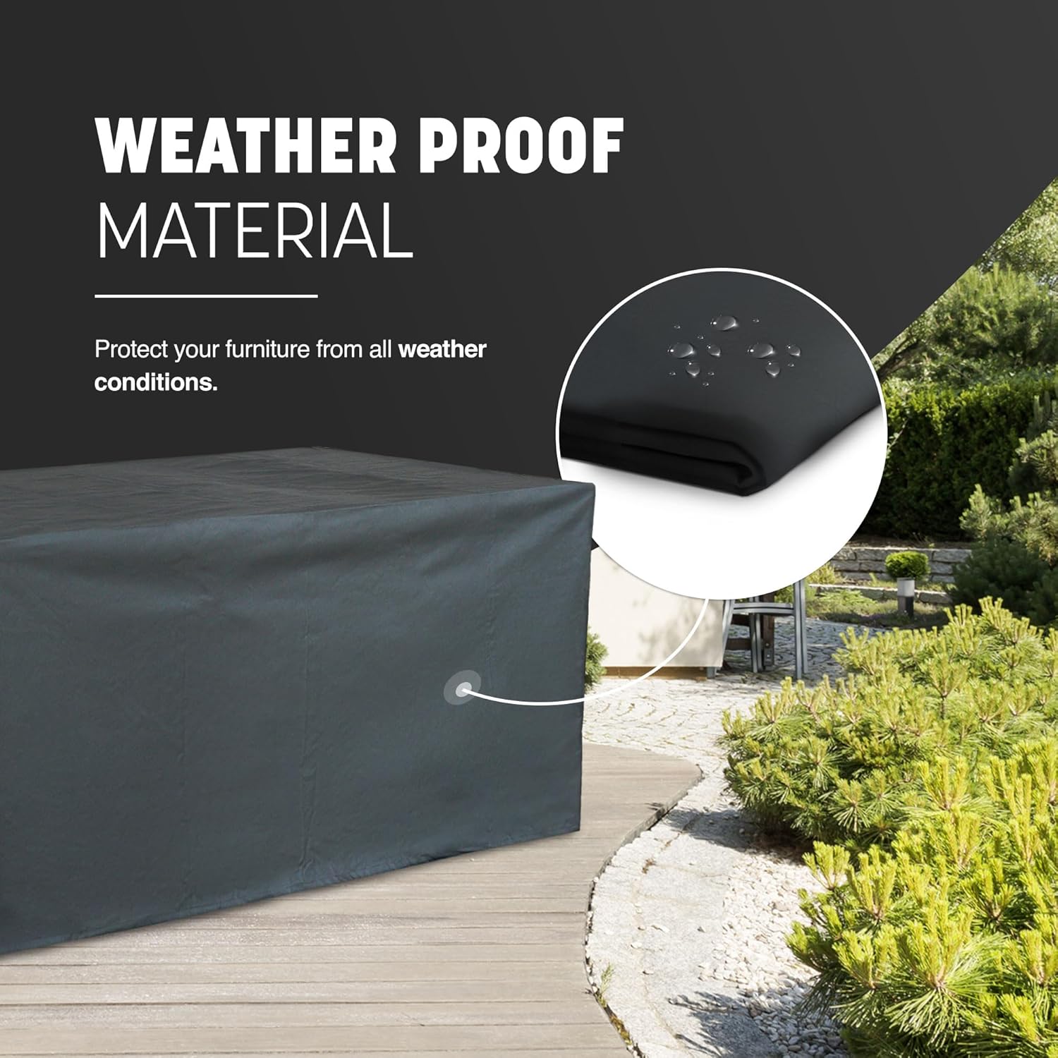 - The attachment straps with a waterproof strip provide a secure and snug fit around your garden furniture. This ensures that outdoor table cover stays in place, even during strong winds or heavy rain. Your furniture will remain protected and secure, no matter the weather conditions.