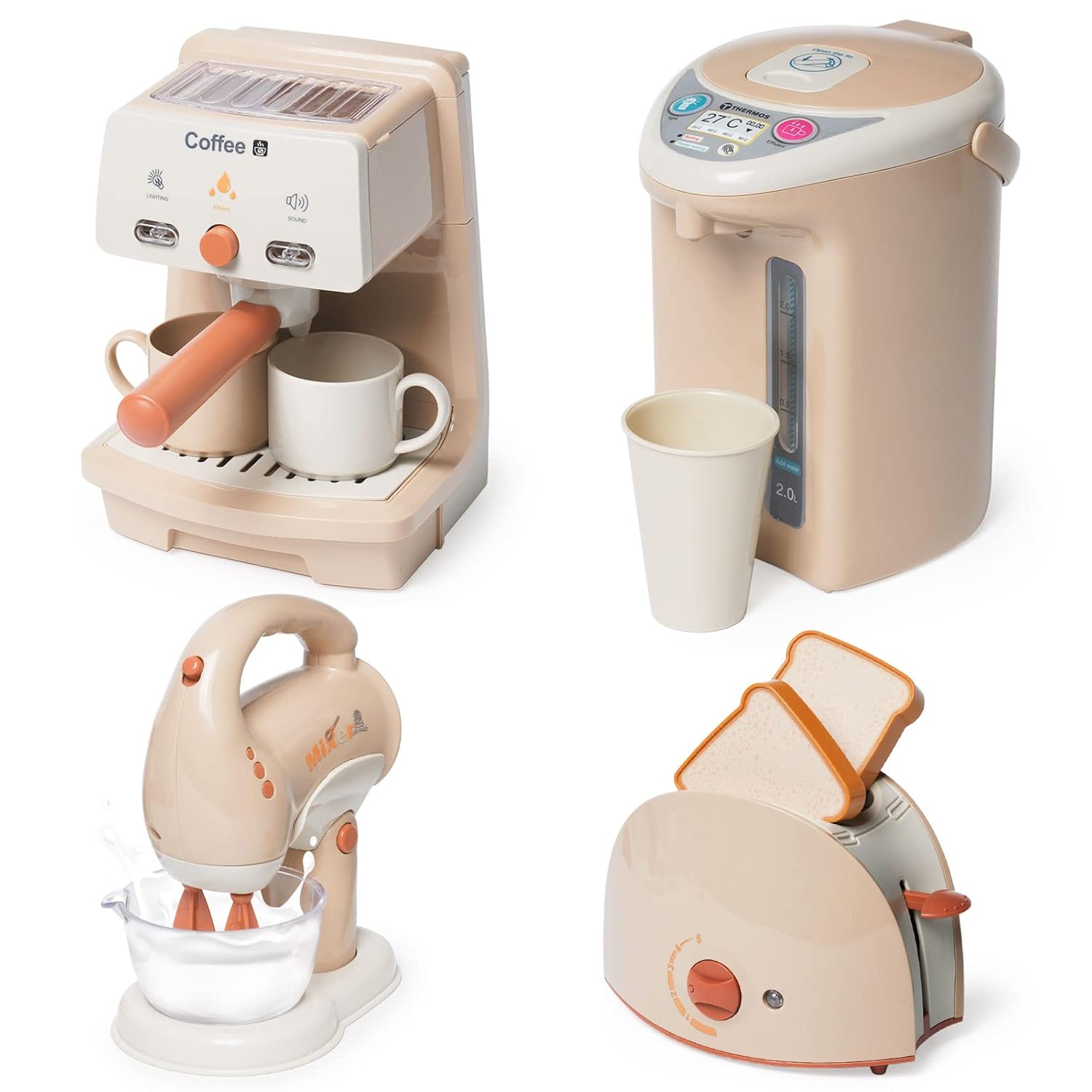 - 【Real appliance function】the mixer to fill with rotating function, the toaster with timer and toast pop-up, the mixer with the rotating whisk and the coffee machine to play with sound effects.