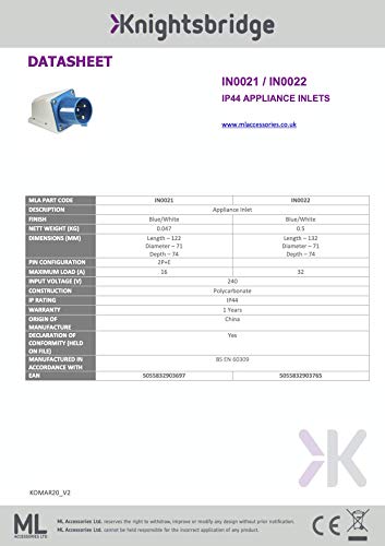 1571 reviews for Knightsbridge IN0021 Appliance Inlet, 240 V, IP44, 16 A