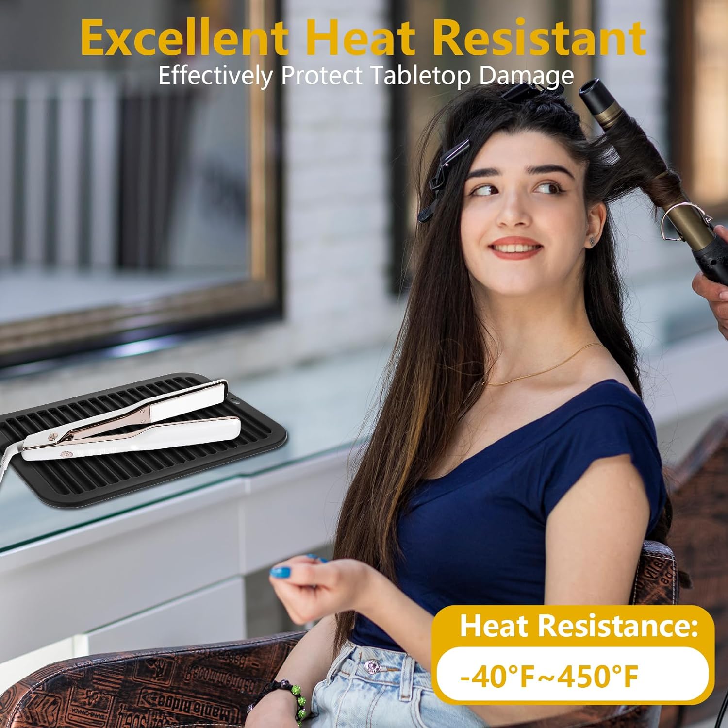 - [Wide Application] Silicone mat protects any type of delicate surface from heat damage from hair straighteners, curling irons and other hair tools, it not only protects your counter or tabletop, but also works well for your family and child safety from contact burns and thermal injury. Suitable for travel, home, storage, work, hair salon and more.