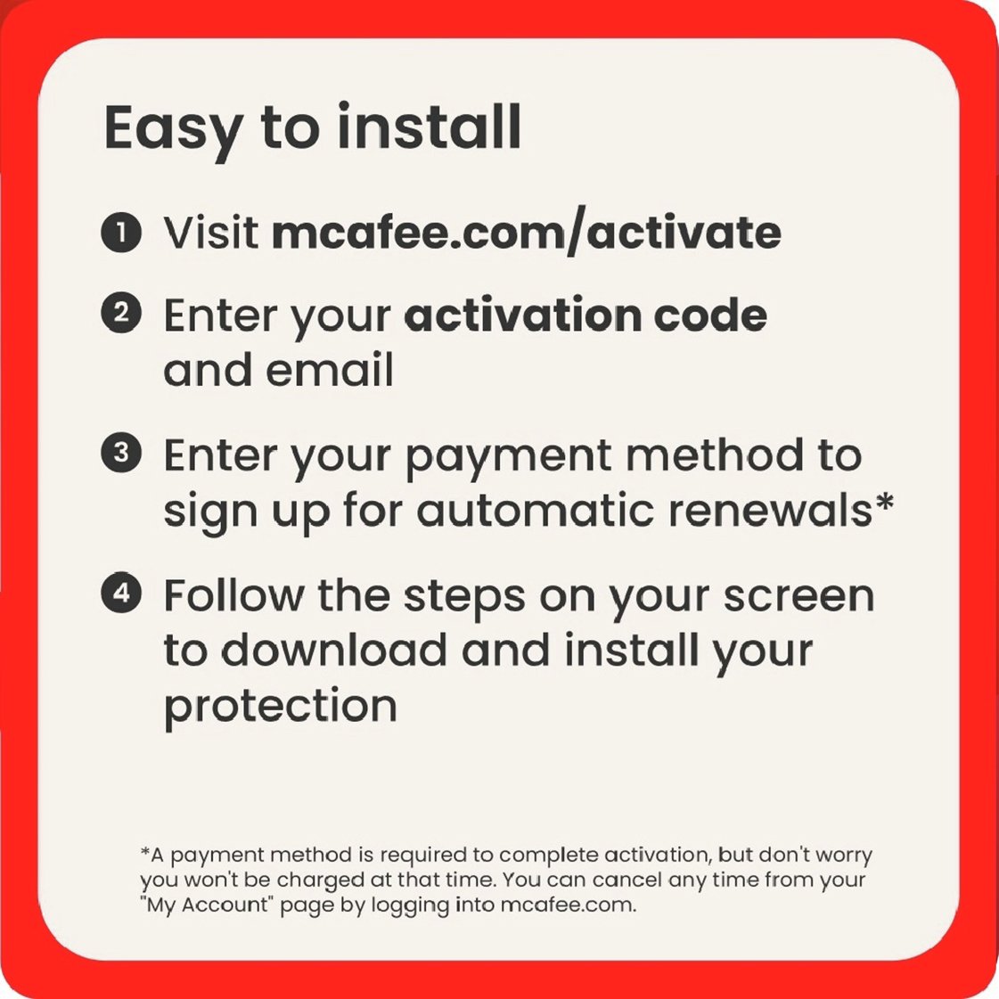 McAfee Auto-Renewal Notice: A payment method is required to complete activation. Your subscription automatically renews annually, and payment will be taken 30 days before the end of your current subscription and annually thereafter at the renewal price at that time. We will remind you 30 days before you are charged. You can cancel your subscription or opt-out of auto-renewal at any time from your My Account at mcafee. Com.