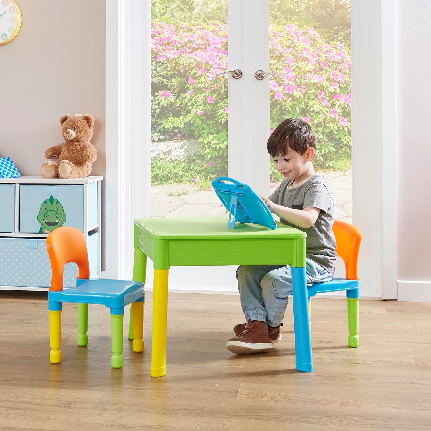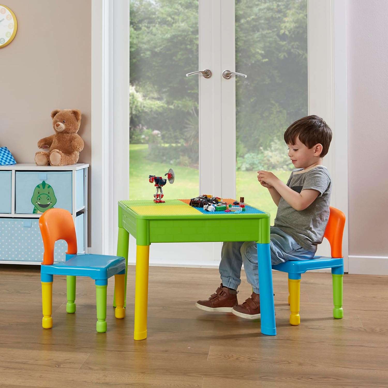 - FEATURES: This multipurpose kids activity table and chair set comes with a reversible and dual-purpose tabletop, one side is smooth for writing, eating, playing, and doing homework. Flip the tabletop over for a construction top surface – ideal for building block play and perfect for little ones who love to build (suitable for all leading brands of building blocks)