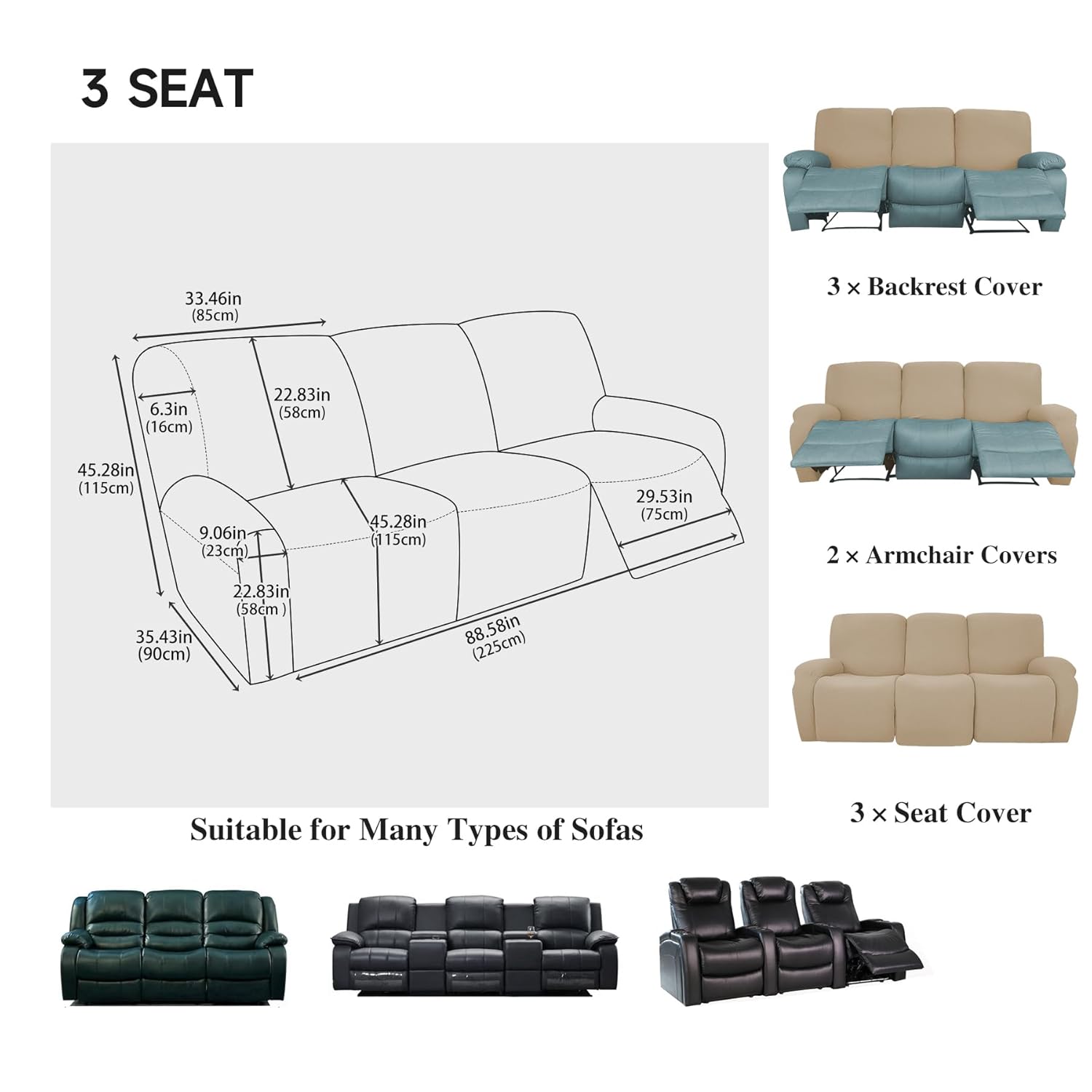 - 【Product Configuration】: This 4 pieces recliner chair cover is elastic enough to fit for most standard recliner chair couch. 1-seater (4-piece set) includes 1 backrest cover, 1 seat cover and 2 armchair covers, and the 2-seater (6-piece set) includes 2 backrest covers, 2 seat covers, 2 armchair covers, 3-seater (set of 8) includes 3 backrest covers, 3 seat covers and 2 armchair covers.