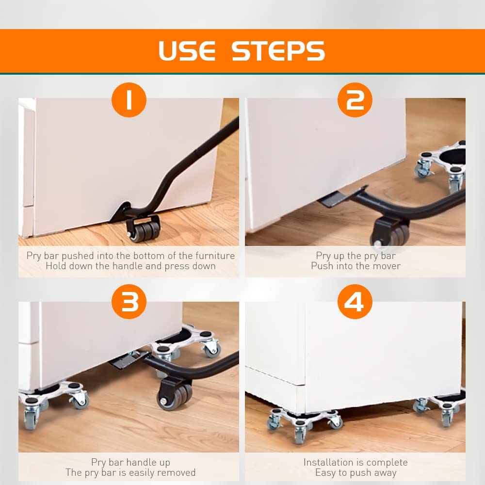 - 【ANTI-SKID AND ANTI-OFF RUBBER MAT】Our furniture moving tool has non-slip and anti-dropping rubber mat. Our furniture mover has super adsorption force to protect the furniture from leaving the panel. The furniture sliders pry bar has an anti-off design, a fixed bending position, and a 120° wide-angle support to prevent dislocation.