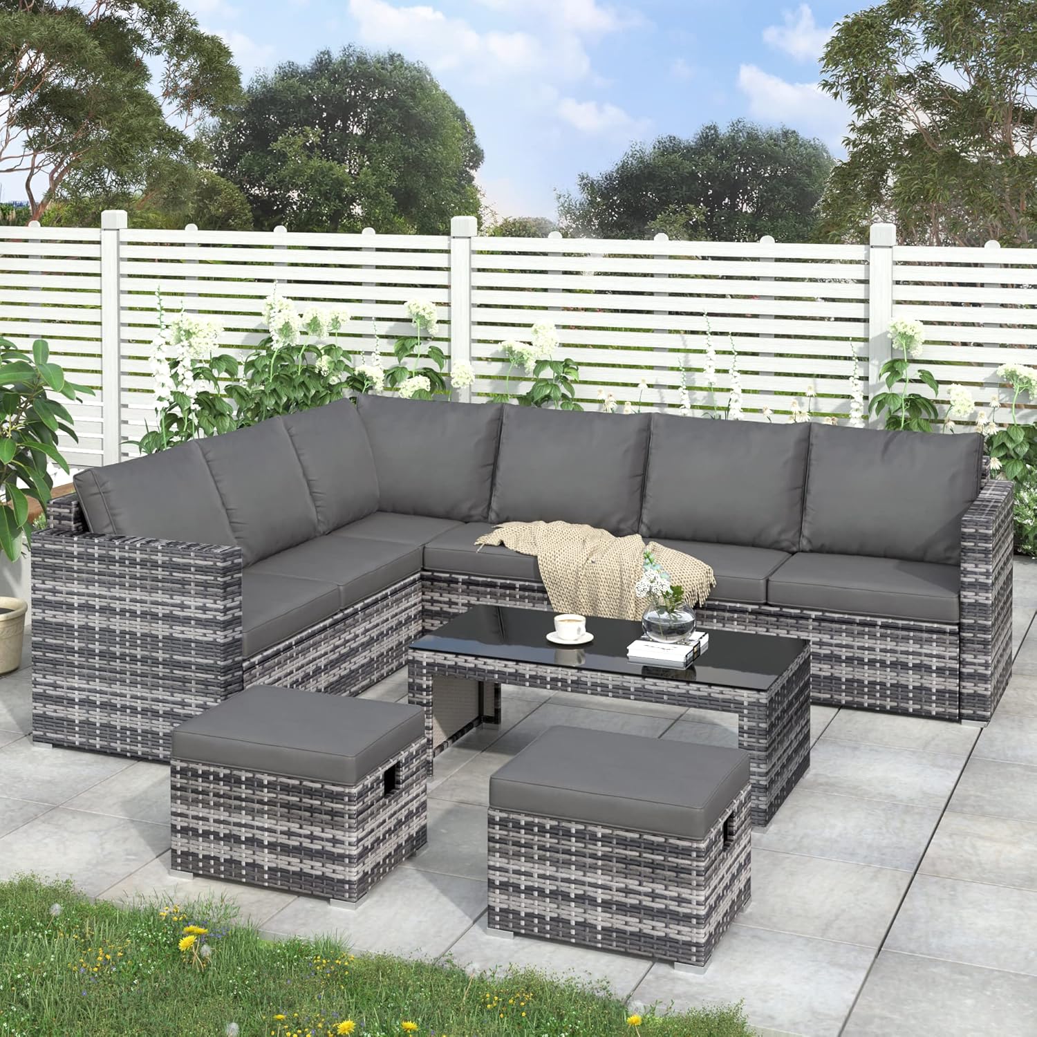 LTGB Rattan Garden Furniture Set, Garden Corner Sofa Set 8 Seater Rattan Sofa Outdoor Furniture with Coffee table 2 stools, Gray 【UK Fast Shippment】