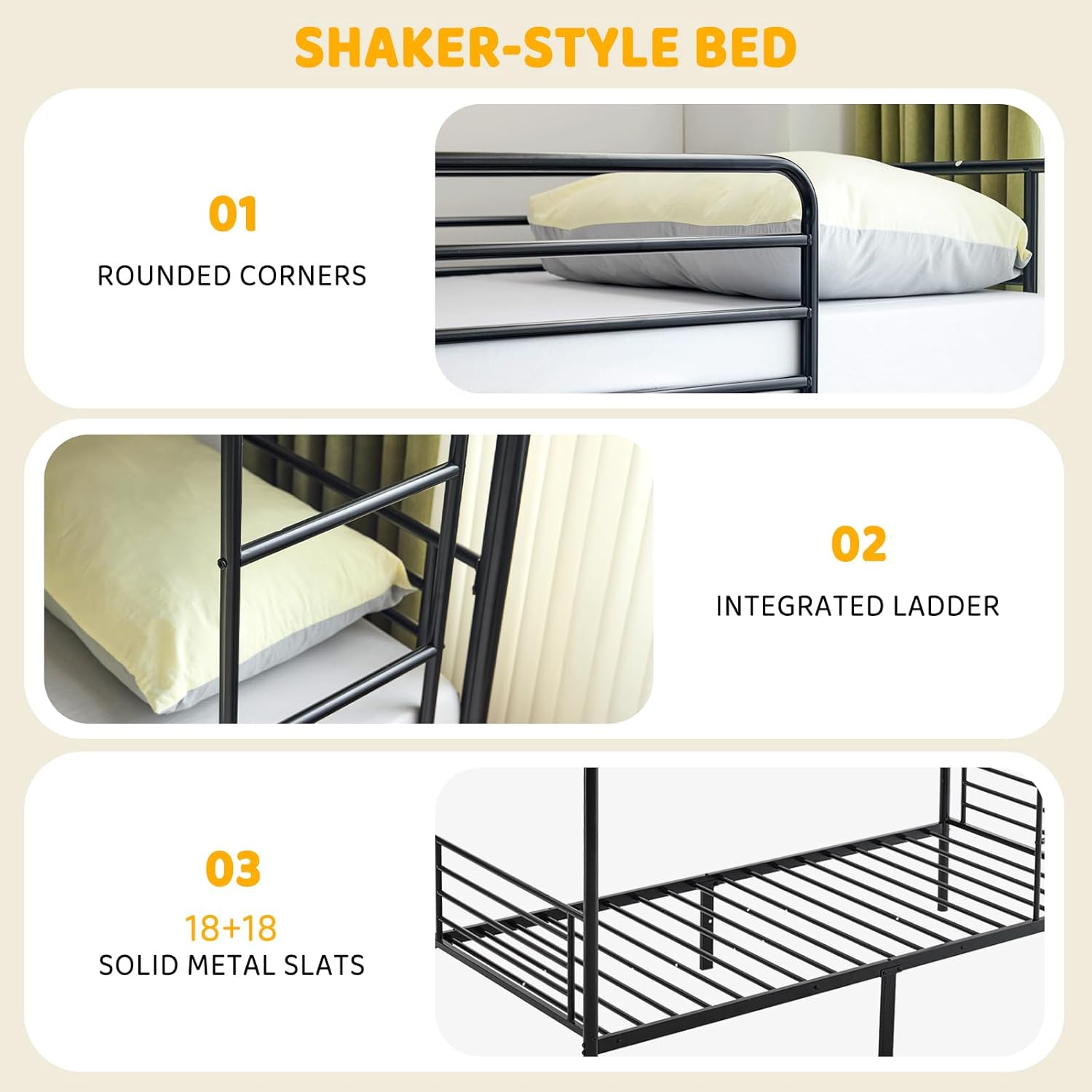 - High Safety Guardrails & Integrated Ladder:The upper bunk of this metal bunk beds is designed with guardrails. The guardrail is 32cm high, so even if you put a mattress on it, you don’t have to worry about your child falling off while sleeping.The curved railing corner design can prevent collisions.These detailed designs ensure safety during use.