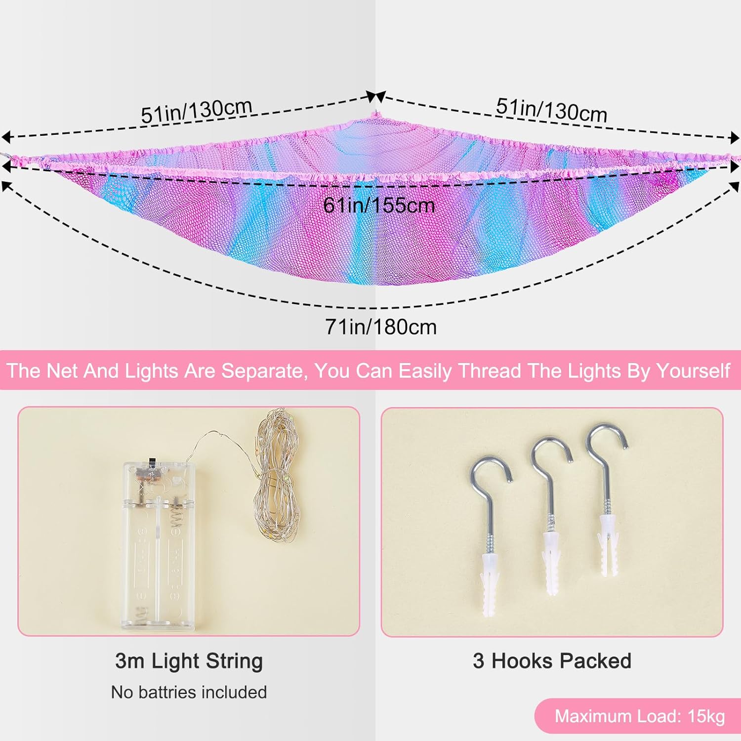 - 💖【Soft Toy Storage Net with LED Light】: The stuffed animals hammock net with plentiful colors, it is a bright and beautiful room decor, also a pratical organizer to hold and display kids toys. It comes with colored LED light string (requires 2pcs AA batteries, NOT including), perfect night light, help your kids get sleep easily.