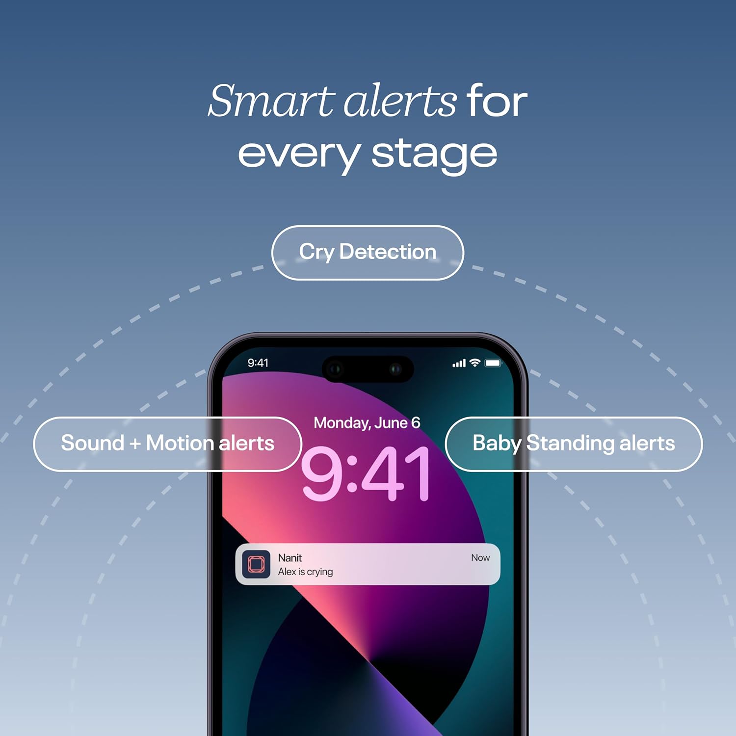 - Smart Alerts: Nanit detects and notifies you in-app when baby really needs you—from Child Out of Bed + Baby Standing notifications to Cry Detection and real-time sound + motion alerts* Sleep tracking and analytics,* plus sensor-free Breathing Motion Monitoring, Temperature + Humidity Tracking, and 2-way audio