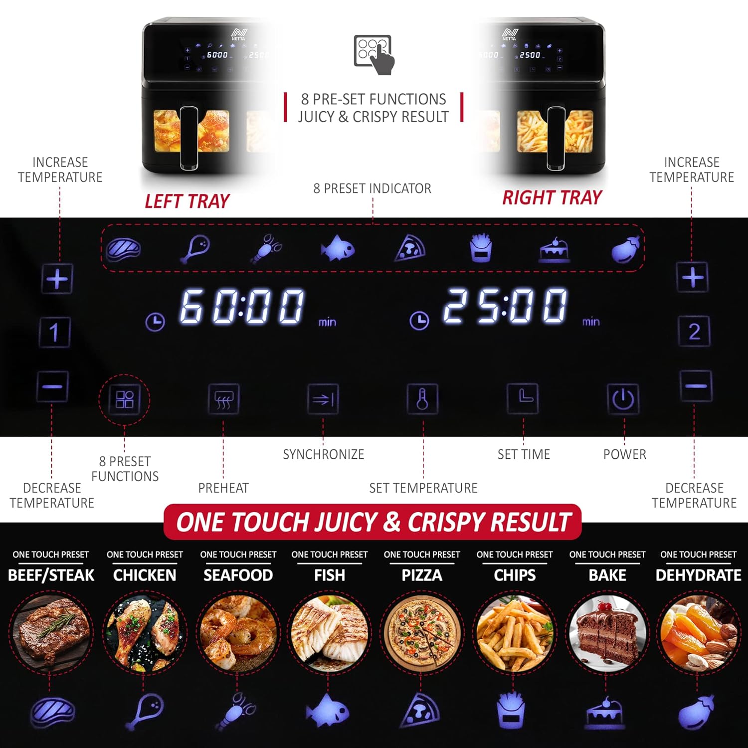 NETTA 8L Dual Basket Low Energy Air Fryer with Digital Smart Programmes – 2 Large Drawers, 8 Pre-Set Functions, 60 Minute Timer, XL Family Size Drawer – Black