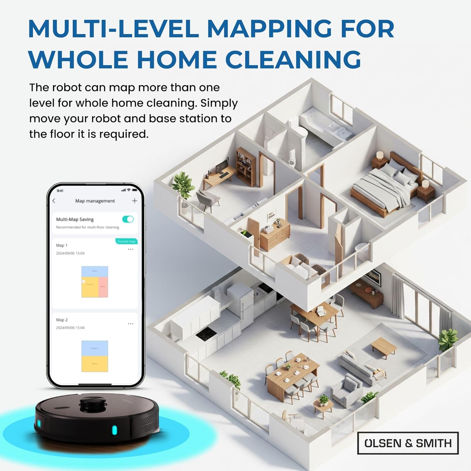 - ADVANCED LIDAR MAPPING: The advanced laser scanning creates precise, multi‑floor digital maps of your home – accurate to millimetres – so the robot knows every room, hallway and carpet edge. Virtual walls, no‑go zones and priority spots can be drawn in the app for tailored coverage, while anti‑drop and bump‑detection sensors prevent it from falling down stairs or bumping into walls.