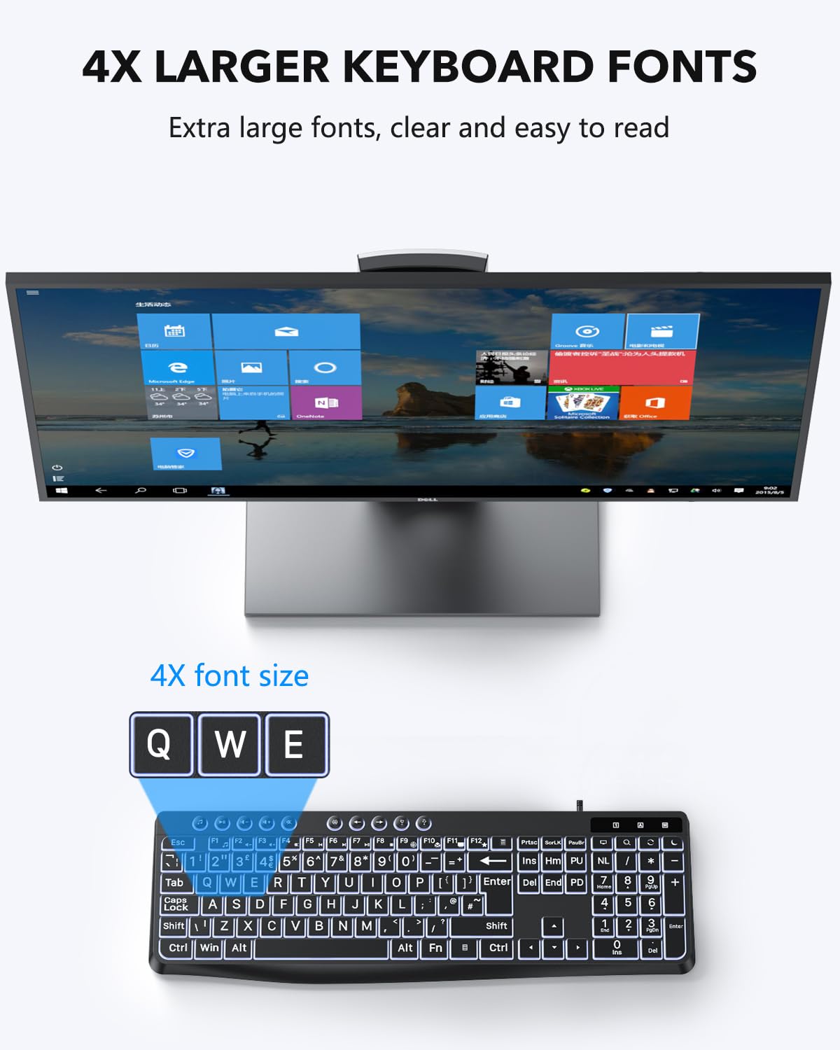 - Large Print Keyboard: This keyboard features large print letters, and the keyboard font is 4X larger than a standard keyboard, which can help those who can’t see the keyboard clearly to reduce the chance of pressing the wrong key. It is perfect for the elderly, students, office workers and the visually impaired